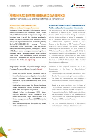 REMUNERASI DEWAN KOMISARIS DAN DIREKSIBoard of Commissioners and Board of Directors RemunerationREMUNERASI DEWAN KOMISARIS Kebijakan dan Dasar Penetapan RemunerasiRemunerasi Dewan Komisaris PHE ditentukan dengan mengacu pada Keputusan Pemegang Saham Secara Sirkuler PT Pertamina Hulu Energi sesuai dengan Surat ketentuan pasal 10 ayat 5 dan 6 tentang penghasilan Direksi dan Dewan Komisaris yang berlaku 01 Januari 2017 (Surat Keputusan Direksi PT Pertamina (Persero) No.Kpts-16/C00000/2013-S0 tentang Pedoman Pengelolaan Anak Perusahaan dan Perusahaan Patungan PT Pertamina (Persero), tertanggal 25 Februari 2013). Dalam proses penetapan remunerasi bagi Dewan Komisaris hanya pemegang saham yang mendapat akses untuk turut menentukan besaran remunerasi yang harus dibayarkan PHE kepada anggota Dewan Komisaris dan Direksi. [102-35] [102-37] Pengungkapan Prosedur Pengusulan Sampai Dengan Penetapan Remunerasi Dewan Komisaris. [102-36] %u2022 Direksi mengusulkan besaran remunerasi kepada Dewan Komisaris untuk mendapatkan rekomendasi. %u2022 Dewan Komisaris dapat membentuk Komite Remunerasi untuk melakukan kajian atas usulan tersebut. %u2022 Berdasarkan rekomendasi dari Dewan Komisaris, Direksi meneruskan usulan remunerasi kepada RUPS untuk mendapatkan pengesahan. %u2022 Sebagai bahan pertimbangan RUPS dalam membuat keputusan, usulan remunerasi dikaji terlebih dahulu oleh Fungsi Subsidiary and Joint Venture Management dan Fungsi SDM PT Pertamina (Persero). %u2022 RUPS menetapkan besaran remunerasi bagi Direksi dan Dewan Komisaris.BOARD OF COMMISSIONERS REMUNERATIONPolicies and Basis for Remuneration DeterminationThe remuneration of the PHE Board of Commissioners is determined by referring to the Circular Shareholder Decision of PT Pertamina Hulu Energi in accordance with the Letter provisions of article 10 paragraphs 5 and 6 concerning earnings of Directors and Board of Commissioners applicable January 1, 2017 (Decree of the Directors of PT Pertamina (Persero) No.Kpts-16/C00000/2013-S0 concerning Guidelines for Management of Subsidiaries and Joint Ventures of PT Pertamina (Persero) , dated February 25, 2013). In the process of determining remuneration for the Board of Commissioners only shareholders who have access to participate determine the amount of remuneration that must be paid by PHE to members of the Board of Commissioners and Directors. Disclosure of the Proposal Procedure Up to the Determination of the Board of Commissioners%u2019 Remuneration.%u2022 Directors propose the amount of remuneration to the Board of Commissioners to get recommendations. %u2022 The Board of Commissioners can establish a Remuneration Committee to review the proposal. %u2022 Based on a recommendation from the Board of Commissioners, the Board of Directors forwards the proposed remuneration to the GMS for approval. %u2022 As a consideration for the GMS in making decisions, the remuneration proposal is first reviewed by the Subsidiary and Joint Venture Management and HR Functions of PT Pertamina (Persero). %u2022 The GMS establishes the amount of remuneration for the Directors and Board of Commissioners.Laporan ManajemenManagement ReportProfil PerusahaanCompany ProfileAnalisa & Diskusi ManajemenManagement Discussion & AnalysisIkhtisar 20202020 HighlightsPT Pertamina Hulu Energi2020 Laporan Tahunan TerintegrasiIntegrated Annual Report 384