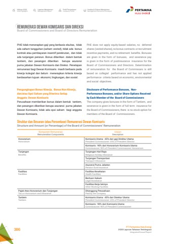 PHE does not apply equity-based salaries, no deferred shares (vested shares), no bonus contracts or recruitment incentive payments, and no retirement benefits. Bonuses are given in the form of bonuses, and severance pay is given in the form of postinsurance insurance for the Board of Commissioners and Directors. Determination of remuneration for the Board of Commissars is still based on collegial performance and has not applied performance criteria based on economic, environmental and social objectives. Disclosure of Performance Bonuses, NonPerformance Bonuses, and/or Share Options Received by Each Member of the Board of Commissioners The company gives bonuses in the form of Tantiem, and severance is given in the form of full term insurance for the Board of Commissioners, there is no stock option for members of the Board of Commissioners.REMUNERASI DEWAN KOMISARIS DAN DIREKSIBoard of Commissioners and Board of Directors RemunerationPHE tidak menerapkan gaji yang berbasis ekuitas, tidak ada saham tangguhan (saham vested), tidak ada bonus kontrak atau pembayaran insentif perekrutan, dan tidak ada tunjangan pensiun. Bonus diberikan dalam bentuk tantiem, dan pesangon diberikan berupa asuransi purna jabatan Dewan Komisaris dan Direksi. Penetapan remunerasi bagi Dewan Komisaris masih berbasis pada kinerja kolegial dan belum menerapkan kriteria kinerja berdasarkan tujuan ekonomi, lingkungan, dan sosial. Pengungkapan Bonus Kinerja, Bonus Non Kinerja, dan/atau Opsi Saham yang Diterima Setiap Anggota Dewan Komisaris Perusahaan memberikan bonus dalam bentuk tantiem, dan pesangon diberikan berupa asuransi purna jabatan Dewan Komisaris, tidak ada opsi saham bagi anggota Dewan Komisaris.Komponen RemunerasiRemuneration ComponentsUraianDescriptionHonorariumHonorariumKomisaris Utama : 45% dari gaji Direktur UtamaPresident Commissioner: 45% of President DirectorKomisaris : 90% dari Honorarium Komisaris UtamaCommissioner: 90% of President Commissioner HonorariumTunjanganBenefitsTunjangan Hari RayaReligious Holiday AllowanceTunjangan TransportasiTransport AllowanceAsuransi Purna JabatanPension fund insuranceFasilitasFacilitiesFasilitas KesehatanHealth FacilitiesBantuan HukumLegal AssistanceFasilitas Kerja lainnyaOther Working FacilitiesPajak Atas Honorarium dan TunjanganTax on Honorarium and AllowanceDitanggung PerusahaanPaid by the CompanyTantiemTantiemKomisaris Utama : 45% dari Direktur UtamaPresident Commissioner: 45% of President DirectorKomisaris : 90% dari Komisaris UtamaCommissioner: 90% of President CommissionerStruktur dan Besaran (atau Persentase) Remunerasi Dewan KomisarisStructure and Amount (or Percentage) of the Board of Commissioners%u2019 RemunerationLaporan ManajemenManagement ReportProfil PerusahaanCompany ProfileAnalisa & Diskusi ManajemenManagement Discussion & AnalysisIkhtisar 20202020 HighlightsPT Pertamina Hulu Energi2020 Laporan Tahunan TerintegrasiIntegrated Annual Report 386