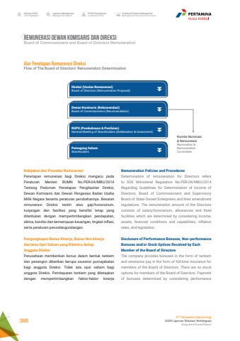 Remuneration Policies and ProceduresDetermination of remuneration for Directors refers to SOE Ministerial Regulation No.PER-04/MBU/2014 Regarding Guidelines for Determination of Income of Directors, Board of Commissioners and Supervisory Board of State-Owned Enterprises and their amendment regulations. The remuneration amount of the Directors consists of salary/honorarium, allowances and fixed facilities which are determined by considering income, assets, financial conditions and capabilities, inflation rates, and legislation. Disclosure of Performance Bonuses, Non-performance Bonuses and/or Stock Options Received by Each Member of the Board of DirectorsThe company provides bonuses in the form of tantiem and severance pay in the form of full-time insurance for members of the Board of Directors. There are no stock options for members of the Board of Directors. Payment of bonuses determined by considering performance REMUNERASI DEWAN KOMISARIS DAN DIREKSIBoard of Commissioners and Board of Directors RemunerationDireksi (Usulan Remunerasi)Board of Directors (Remuneration Proposal)Komite Nominasi & RemunerasiNomination & Remuneration CommitteeDewan Komisaris (Rekomendasi)Board of Commissioners (Recomendation)RUPS (Pembahasan & Penilaian)General Meeting of Shareholders (Deliberation & Assesment)Pemegang SahamShareholdersAlur Penetapan Remunerasi DireksiFlow of The Board of Directors%u2019 Remuneration Determination Kebijakan dan Prosedur RemunerasiPenetapan remunerasi bagi Direksi mengacu pada Peraturan Menteri BUMN No.PER-04/MBU/2014 Tentang Pedoman Penetapan Penghasilan Direksi, Dewan Komisaris dan Dewan Pengawas Badan Usaha Milik Negara beserta peraturan perubahannya. Besaran remunerasi Direksi terdiri atas gaji/honorarium, tunjangan dan fasilitas yang bersifat tetap yang ditentukan dengan mempertimbangkan pendapatan, aktiva, kondisi dan kemampuan keuangan, tingkat inflasi, serta peraturan perundangundangan. Pengungkapan Bonus Kinerja, Bonus Non kinerja dan/atau Opsi Saham yang Diterima Setiap Anggota DireksiPerusahaan memberikan bonus dalam bentuk tantiem dan pesangon diberikan berupa asuransi purnajabatan bagi anggota Direksi. Tidak ada opsi saham bagi anggota Direksi. Pembayaran tantiem yang ditetapkan dengan mempertimbangkan faktor-faktor kinerja Laporan ManajemenManagement ReportProfil PerusahaanCompany ProfileAnalisa & Diskusi ManajemenManagement Discussion & AnalysisIkhtisar 20202020 HighlightsPT Pertamina Hulu Energi2020 Laporan Tahunan TerintegrasiIntegrated Annual Report 388