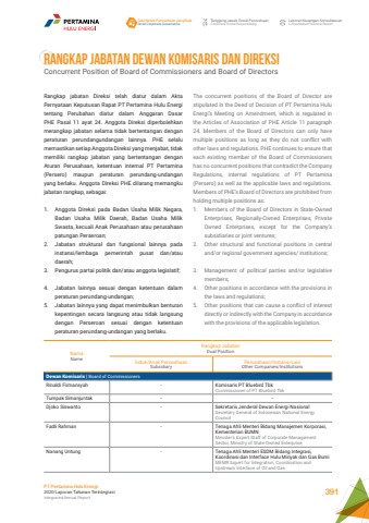 RANGKAP JABATAN DEWAN KOMISARIS DAN DIREKSIConcurrent Position of Board of Commissioners and Board of DirectorsRangkap jabatan Direksi telah diatur dalam Akta Pernyataan Keputusan Rapat PT Pertamina Hulu Energi tentang Perubahan diatur dalam Anggaran Dasar PHE Pasal 11 ayat 24. Anggota Direksi diperbolehkan merangkap jabatan selama tidak bertentangan dengan peraturan perundangundangan lainnya. PHE selalu memastikan setiap Anggota Direksi yang menjabat, tidak memiliki rangkap jabatan yang bertentangan dengan Aturan Perusahaan, ketentuan internal PT Pertamina (Persero) maupun peraturan perundang-undangan yang berlaku. Anggota Direksi PHE dilarang memangku jabatan rangkap, sebagai: 1. Anggota Direksi pada Badan Usaha Milik Negara, Badan Usaha Milik Daerah, Badan Usaha Milik Swasta, kecuali Anak Perusahaan atau perusahaan patungan Perseroan; 2. Jabatan struktural dan fungsional lainnya pada instansi/lembaga pemerintah pusat dan/atau daerah; 3. Pengurus partai politik dan/atau anggota legislatif;4. Jabatan lainnya sesuai dengan ketentuan dalam peraturan perundang-undangan; 5. Jabatan lainnya yang dapat menimbulkan benturan kepentingan secara langsung atau tidak langsung dengan Perseroan sesuai dengan ketentuan peraturan perundang-undangan yang berlaku.The concurrent positions of the Board of Director are stipulated in the Deed of Decision of PT Pertamina Hulu Energi%u2019s Meeting on Amendment, which is regulated in the Articles of Association of PHE Article 11 paragraph 24. Members of the Board of Directors can only have multiple positions as long as they do not conflict with other laws and regulations. PHE continues to ensure that each existing member of the Board of Commissioners has no concurrent positions that contradict the Company Regulations, internal regulations of PT Pertamina (Persero) as well as the applicable laws and regulations. Members of PHE%u2019s Board of Directors are prohibited from holding multiple positions as: 1. Members of the Board of Directors in State-Owned Enterprises, Regionally-Owned Enterprises, Private Owned Enterprises, except for the Company%u2019s subsidiaries or joint ventures; 2. Other structural and functional positions in central and/or regional government agencies/ institutions; 3. Management of political parties and/or legislative members; 4. Other positions in accordance with the provisions in the laws and regulations; 5. Other positions that can cause a conflict of interest directly or indirectly with the Company in accordance with the provisions of the applicable legislation.NamaNameRangkap JabatanDual PositionInduk/Anak PerusahaanSubsidiaryPerusahaan/Instansi LainOther Companies/InstitutionsDewan Komisaris | Board of CommissionersRinaldi Firmansyah - Komisaris PT Bluebird TbkCommissioner of PT Bluebird TbkTumpak Simanjuntak - -Djoko Siswanto - Sekretaris Jenderal Dewan Energi NasionalSecretary General of Indonesian National Energy CouncilFadli Rahman - Tenaga Ahli Menteri Bidang Manajemen Korporasi, Kementerian BUMNMinister's Expert Staff of Corporate Management Sector, Ministry of State-Owned EnterpriseNanang Untung - Tenaga Ahli Menteri ESDM Bidang Integrasi, Koordinasi dan Interface Hulu Minyak dan Gas BumiMEMR Expert for Integration, Coordination and Upstream Interface of Oil and GasTata Kelola Perusahaan yang BaikGood Corporate GovernanceTanggung Jawab Sosial PerusahaanCorporate Social ResponsibilityLaporan Keuangan KonsolidasianConsolidated Financial ReportPT Pertamina Hulu Energi2020 Laporan Tahunan TerintegrasiIntegrated Annual Report 391