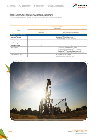 NamaNameRangkap JabatanDual PositionInduk/Anak PerusahaanSubsidiaryPerusahaan/Instansi LainOther Companies/InstitutionsDireksi | Board of DirectorsBudiman Parhusip - Komisaris PT Archi IndonesiaCommissioner of PT Archi Indonesia John Hisar Simamora - -Taufik Aditiyawarman - -Medy Kurniawan - -Lelin Eprianto - %u2022 Komisaris Utama PT Patra Jasa President Commissioners of PT Patra Jasa%u2022 Komisaris PT Pertamina Hulu IndonesiaCommissioner of PT Pertamina Hulu IndonesiaHarry Mozarta Zen - Komisaris Maurel & PromCommissioner of Maurel & PromRANGKAP JABATAN DEWAN KOMISARIS DAN DIREKSIConcurrent Position of Board of Commissioners and Board of DirectorsLaporan ManajemenManagement ReportProfil PerusahaanCompany ProfileAnalisa & Diskusi ManajemenManagement Discussion & AnalysisIkhtisar 20202020 HighlightsPT Pertamina Hulu Energi2020 Laporan Tahunan TerintegrasiIntegrated Annual Report 392