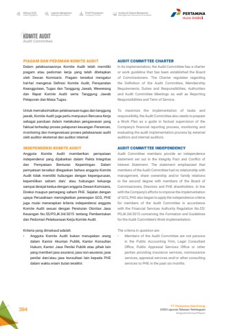 Komite auditAudit CommitteePIAGAM DAN PEDOMAN KOMITE AUDITDalam pelaksanaannya Komite Audit telah memiliki piagam atau pedoman kerja yang telah ditetapkan oleh Dewan Komisaris. Piagam tersebut mengatur hal-hal mengenai Definisi Komite Audit, Persyaratan Keanggotaan, Tugas dan Tanggung Jawab, Wewenang dan Rapat Komite Audit serta Tanggung Jawab Pelaporan dan Masa Tugas.Untuk memaksimalkan pelaksanaan tugas dan tanggung jawab, Komite Audit juga perlu menyusun Rencana Kerja sebagai panduan dalam melakukan pengawasan yang faktual terhadap proses pelaporan keuangan Perseroan, monitoring dan mengevaluasi proses pelaksanaan audit oleh auditor eksternal dan auditor internal.INDEPENDENSI KOMITE AUDITAnggota Komite Audit memberikan pernyataan independensi yang dijabarkan dalam Pakta Integritas dan Pernyataan Benturan Kepentingan. Dalam pernyataan tersebut ditegaskan bahwa anggota Komite Audit tidak memiliki hubungan dengan kepengurusan, kepemilikan saham dan/ atau hubungan keluarga sampai derajat kedua dengan anggota Dewan Komisaris, Direksi maupun pemegang saham PHE. Sejalan dengan upaya Perusahaan meningkatkan penerapan GCG, PHE juga mulai menerapkan kriteria independensi anggota Komite Audit sesuai dengan Peraturan Otoritas Jasa Keuangan No.55/POJK.04/2015 tentang Pembentukan dan Pedoman Pelaksanaan Kerja Komite Audit. Kriteria yang dimaksud adalah: %u2022 Anggota Komite Audit bukan merupakan orang dalam Kantor Akuntan Publik, Kantor Konsultan Hukum, Kantor Jasa Penilai Publik atau pihak lain yang memberi jasa asuransi, jasa non-asuransi, jasa penilai dan/atau jasa konsultasi lain kepada PHE dalam waktu enam bulan terakhir. AUDIT COMMITTEE CHARTERIn its implementation, the Audit Committee has a charter or work guideline that has been established the Board of Commissioners. The Charter regulates regarding the Definition of the Audit Committee, Membership Requirements, Duties and Responsibilities, Authorities and Audit Committee Meetings as well as Reporting Responsibilities and Term of Service. To maximize the implementation of tasks and responsibility, the Audit Committee also needs to prepare a Work Plan as a guide in factual supervision of the Company%u2019s financial reporting process, monitoring and evaluating the audit implementation process by external auditors and internal auditors.AUDIT COMMITTEE INDEPENDENCYAudit Committee members provide an independence statement set out in the Integrity Pact and Conflict of Interest Statement. The statement emphasized that members of the Audit Committee had no relationship with management, share ownership and/or family relations to the second degree with members of the Board of Commissioners, Directors and PHE shareholders. In line with the Company%u2019s efforts to improve the implementation of GCG, PHE also began to apply the independence criteria for members of the Audit Committee in accordance with the Financial Services Authority Regulation No.55/POJK.04/2015 concerning the Formation and Guidelines for the Audit Committee%u2019s Work Implementation. The criteria in question are: %u2022 Members of the Audit Committee are not persons in the Public Accounting Firm, Legal Consultant Office, Public Appraisal Services Office or other parties providing insurance services, noninsurance services, appraisal services and/or other consulting services to PHE in the past six months. Laporan ManajemenManagement ReportProfil PerusahaanCompany ProfileAnalisa & Diskusi ManajemenManagement Discussion & AnalysisIkhtisar 20202020 HighlightsPT Pertamina Hulu Energi2020 Laporan Tahunan TerintegrasiIntegrated Annual Report 394
