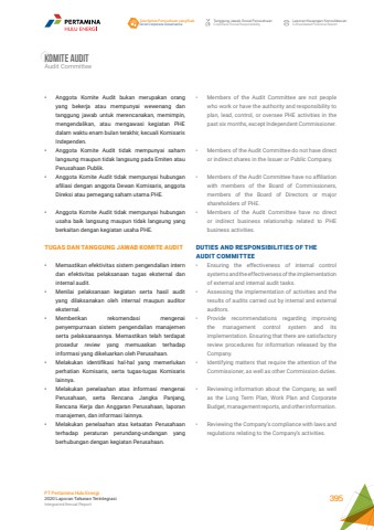 Komite auditAudit Committee%u2022 Anggota Komite Audit bukan merupakan orang yang bekerja atau mempunyai wewenang dan tanggung jawab untuk merencanakan, memimpin, mengendalikan, atau mengawasi kegiatan PHE dalam waktu enam bulan terakhir, kecuali Komisaris Independen. %u2022 Anggota Komite Audit tidak mempunyai saham langsung maupun tidak langsung pada Emiten atau Perusahaan Publik. %u2022 Anggota Komite Audit tidak mempunyai hubungan afiliasi dengan anggota Dewan Komisaris, anggota Direksi atau pemegang saham utama PHE.%u2022 Anggota Komite Audit tidak mempunyai hubungan usaha baik langsung maupun tidak langsung yang berkaitan dengan kegiatan usaha PHE.TUGAS DAN TANGGUNG JAWAB KOMITE AUDIT%u2022 Memastikan efektivitas sistem pengendalian intern dan efektivitas pelaksanaan tugas eksternal dan internal audit. %u2022 Menilai pelaksanaan kegiatan serta hasil audit yang dilaksanakan oleh internal maupun auditor eksternal. %u2022 Memberikan rekomendasi mengenai penyempurnaan sistem pengendalian manajemen serta pelaksanaannya. Memastikan telah terdapat prosedur review yang memuaskan terhadap informasi yang dikeluarkan oleh Perusahaan. %u2022 Melakukan identifikasi hal-hal yang memerlukan perhatian Komisaris, serta tugas-tugas Komisaris lainnya. %u2022 Melakukan penelaahan atas informasi mengenai Perusahaan, serta Rencana Jangka Panjang, Rencana Kerja dan Anggaran Perusahaan, laporan manajemen, dan informasi lainnya. %u2022 Melakukan penelaahan atas ketaatan Perusahaan terhadap peraturan perundang-undangan yang berhubungan dengan kegiatan Perusahaan. %u2022 Members of the Audit Committee are not people who work or have the authority and responsibility to plan, lead, control, or oversee PHE activities in the past six months, except Independent Commissioner. %u2022 Members of the Audit Committee do not have direct or indirect shares in the Issuer or Public Company. %u2022 Members of the Audit Committee have no affiliation with members of the Board of Commissioners, members of the Board of Directors or major shareholders of PHE. %u2022 Members of the Audit Committee have no direct or indirect business relationship related to PHE business activities.DUTIES AND RESPONSIBILITIES OF THE AUDIT COMMITTEE%u2022 Ensuring the effectiveness of internal control systems and the effectiveness of the implementation of external and internal audit tasks. %u2022 Assessing the implementation of activities and the results of audits carried out by internal and external auditors. %u2022 Provide recommendations regarding improving the management control system and its implementation. Ensuring that there are satisfactory review procedures for information released by the Company.%u2022 Identifying matters that require the attention of the Commissioner, as well as other Commission duties. %u2022 Reviewing information about the Company, as well as the Long Term Plan, Work Plan and Corporate Budget, management reports, and other information. %u2022 Reviewing the Company%u2019s compliance with laws and regulations relating to the Company%u2019s activities. Tata Kelola Perusahaan yang BaikGood Corporate GovernanceTanggung Jawab Sosial PerusahaanCorporate Social ResponsibilityLaporan Keuangan KonsolidasianConsolidated Financial ReportPT Pertamina Hulu Energi2020 Laporan Tahunan TerintegrasiIntegrated Annual Report 395