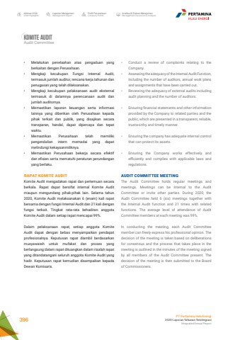 Komite auditAudit Committee%u2022 Melakukan penelaahan atas pengaduan yang berkaitan dengan Perusahaan. %u2022 Mengkaji kecukupan Fungsi Internal Audit, termasuk jumlah auditor, rencana kerja tahunan dan penugasan yang telah dilaksanakan. %u2022 Mengkaji kecukupan pelaksanaan audit eksternal termasuk di dalamnya perencanaan audit dan jumlah auditornya. %u2022 Memastikan laporan keuangan serta informasi lainnya yang diberikan oleh Perusahaan kepada pihak terkait dan publik, yang disajikan secara transparan, handal, dapat dipercaya dan tepat waktu. %u2022 Memastikan Perusahaan telah memiliki pengendalian intern memadai yang dapat melindungi kekayaanmiliknya. %u2022 Memastikan Perusahaan bekerja secara efektif dan efisien serta mematuhi peraturan perundangan yang berlaku.RAPAT KOMITE AUDITKomite Audit mengadakan rapat dan pertemuan secara berkala. Rapat dapat bersifat internal Komite Audit maupun mengundang pihak-pihak lain. Selama tahun 2020, Komite Audit melaksanakan 6 (enam) kali rapat bersama dengan fungsi Internal Audit dan 21 kali dengan fungsi terkait. Tingkat rata-rata kehadiran anggota Komite Audit dalam setiap rapat mencapai 99%.Dalam pelaksanaan rapat, setiap anggota Komite Audit dapat dengan bebas menyampaikan pendapat profesionalnya. Keputusan rapat diambil berdasarkan musyawarah untuk mufakat dan proses yang berlangsung dalam rapat dituangkan dalam risalah rapat yang ditandatangani seluruh anggota Komite Audit yang hadir. Keputusan rapat kemudian disampaikan kepada Dewan Komisaris.%u2022 Conduct a review of complaints relating to the Company. %u2022 Assessing the adequacy of the Internal Audit Function, including the number of auditors, annual work plans and assignments that have been carried out. %u2022 Reviewing the adequacy of external audits including audit planning and the number of auditors. %u2022 Ensuring financial statements and other information provided by the Company to related parties and the public, which are presented in a transparent, reliable, trustworthy and timely manner. %u2022 Ensuring the company has adequate internal control that can protect its assets. %u2022 Ensuring the Company works effectively and efficiently and complies with applicable laws and regulations.AUDIT COMMITTEE MEETINGThe Audit Committee holds regular meetings and meetings. Meetings can be internal to the Audit Committee or invite other parties. During 2020, the Audit Committee held 6 (six) meetings together with the Internal Audit function and 21 times with related functions. The average level of attendance of Audit Committee members at each meeting was 99%. In conducting the meeting, each Audit Committee member can freely express his professional opinion. The decision of the meeting is taken based on deliberations for consensus and the process that takes place in the meeting is outlined in the minutes of the meeting signed by all members of the Audit Committee present. The decision of the meeting is then submitted to the Board of Commissioners.Laporan ManajemenManagement ReportProfil PerusahaanCompany ProfileAnalisa & Diskusi ManajemenManagement Discussion & AnalysisIkhtisar 20202020 HighlightsPT Pertamina Hulu Energi2020 Laporan Tahunan TerintegrasiIntegrated Annual Report 396