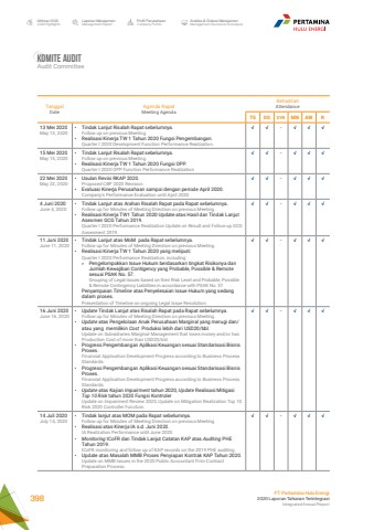 Komite auditAudit CommitteeLaporan ManajemenManagement ReportProfil PerusahaanCompany ProfileAnalisa & Diskusi ManajemenManagement Discussion & AnalysisIkhtisar 20202020 HighlightsPT Pertamina Hulu Energi2020 Laporan Tahunan TerintegrasiIntegrated Annual Report 398TanggalDateAgenda RapatMeeting Agenda KehadiranAttendanceTS DS SYR MN AW R13 Mei 2020May 13, 2020%u2022 Tindak Lanjut Risalah Rapat sebelumnya.Follow up on previous Meeting.%u2022 Realisasi Kinerja TW 1 Tahun 2020 Fungsi Pengembangan.Quarter I 2020 Development Function Performance Realization.%u221a %u221a - %u221a %u221a %u221a15 Mei 2020May 15, 2020%u2022 Tindak Lanjut Risalah Rapat sebelumnya.Follow up on previous Meeting.%u2022 Realisasi Kinerja TW 1 Tahun 2020 Fungsi OPP.Quarter I 2020 OPP Function Performance Realization %u221a %u221a - %u221a %u221a %u221a22 Mei 2020May 22, 2020%u2022 Usulan Revisi RKAP 2020.Proposed CBP 2020 Revision.%u2022 Evaluasi Kinerja Perusahaan sampai dengan periode April 2020.Company's Performance Evaluation until April 2020.%u221a %u221a - %u221a %u221a %u221a4 Juni 2020June 4, 2020%u2022 Tindak Lanjut atas Arahan Risalah Rapat pada Rapat sebelumnya.Follow up for Minutes of Meeting Direction on previous Meeting.%u2022 Realisasi Kinerja TW1 Tahun 2020 Update atas Hasil dan Tindak Lanjut Asesmen GCG Tahun 2019.Quarter I 2020 Performance Realization Update on Result and Follow-up GCG Assesment 2019.%u221a %u221a - %u221a %u221a %u221a11 Juni 2020June 11, 2020%u2022 Tindak Lanjut atas MoM pada Rapat sebelumnya.Follow up for Minutes of Meeting Direction on previous Meeting.%u2022 Realisasi Kinerja TW 1 Tahun 2020 yang meliputi: Quarter I 2020 Performance Realization, including:%u00bb Pengelompokkan Issue Hukum berdasarkan tingkat Risikonya dan Jumlah Kewajiban Contigency yang Probable, Possible & Remote sesuai PSAK No. 57. Grouping of Legal Issues based on their Risk Level and Probable, Possible & Remote Contingency Liabilities in accordance with PSAK No. 57.Penyampaian Timeline atas Penyelesaian Issue Hukum yang sedang dalam proses.Presentation of Timeline on ongoing Legal Issue Resolution.%u221a %u221a - %u221a %u221a %u221a16 Juni 2020June 16, 2020%u2022 Update Tindak Lanjut atas Risalah Rapat pada Rapat sebelumnya.Follow up for Minutes of Meeting Direction on previous Meeting.%u2022 Update atas Pengelolaan Anak Perusahaan Marginal yang merugi dan/atau yang memilikin Cost Produksi lebih dari USD20/bbl.Update on Subsidiaries Marginal Management that loses money and/or has Production Cost of more than USD20/bbl.%u2022 Progress Pengembangan Aplikasi Keuangan sesuai Standarisasi Bisnis Proses.Financial Application Development Progress according to Business Process Standards.%u2022 Progress Pengembangan Aplikasi Keuangan sesuai Standarisasi Bisnis Proses.Financial Application Development Progress according to Business Process Standards.%u2022 Update atas Kajian Impairment tahun 2020, Update Realisasi Mitigasi Top 10 Risk tahun 2020 Fungsi KontrolerUpdate on Impairment Review 2020, Update on Mitigation Realization Top 10 Risk 2020 Controller Function.%u221a %u221a - %u221a %u221a %u221a14 Juli 2020July 14, 2020%u2022 Tindak lanjut atas MOM pada Rapat sebelumnya.Follow up for Minutes of Meeting Direction on previous Meeting.%u2022 Realisasi atas Kinerja IA s.d. Juni 2020.IA Realization Performance until June 2020.%u2022 Monitoring ICoFR dan Tindak Lanjut Catatan KAP atas Auditing PHE Tahun 2019.ICoFR monitoring and follow up of KAP records on the 2019 PHE auditing.%u2022 Update atas Masalah MMB Proses Penyiapan Kontrak KAP Tahun 2020.Update on MMB Issues in the 2020 Public Accountant Firm Contract Preparation Process.%u221a %u221a - %u221a %u221a %u221a