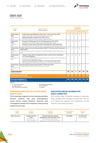 Komite auditAudit CommitteePENDIDIKAN DAN/ATAU PELATIHAN UNTUK KOMITE AUDITPHE menyertakan anggota Komite Audit pada pendidikan dan/atau pelatihan, baik yang diselenggarakan secara internal maupun eksternal. Tujuannya untuk meningkatkan keahlian dan kompetensi masing-masing anggota Komite Audit.EDUCATION AND/OR TRAINING FOR AUDIT COMMITTEEPHE includes Audit Committee members in education and/or training, both internally and externally. The aim is to improve the expertise and competence of each member of the Audit Committee.Nama NameJabatanPositionPelatihanTrainingPenyelenggaraOrganizerTanggalDateDjoko Siswanto Anggota Komite Audit Member of the Audit CommitteeTraining Awareness System Management Anti Suap ISO 37001Training Awareness System Management Anti-bribery ISO 37001TUV NORD 4-5 Mei 2020May 4-5, 2020Laporan ManajemenManagement ReportProfil PerusahaanCompany ProfileAnalisa & Diskusi ManajemenManagement Discussion & AnalysisIkhtisar 20202020 HighlightsPT Pertamina Hulu Energi2020 Laporan Tahunan TerintegrasiIntegrated Annual Report 400TanggalDateAgenda RapatMeeting Agenda KehadiranAttendanceTS DS SYR MN AW R25 November 2020November 25, 2020%u2022 Tindak lanjut atas WBS tahun 2016, 2017, 2018, 2019 dan 2020.Follow-up on WBS in 2016, 2017,2018,2019 and 2020.%u2022 Update penerapan sertifikat ISO 37001:2016.ISO 37001:2016 Certification Update Implementation.%u221a %u221a %u221a %u221a - -2 Desember 2020December 2, 2020%u2022 Persiapan Perhitungan PSL dan Pembukuannya Tahun 2020.Preparation for PSL Calculation and its Bookkeeping in 2020.%u2022 Dampak UU Cipta Kerja Terhadap Perhitungan PSL 2020 (Bila ada).The Impact of the Job Creation Law on the 2020 PSL Calculation (if any).%u221a %u221a %u221a %u221a - -10 Desember 2020December 10, 2020Kinerja Corporate Social Responsibility (CSR) PT PHE dan Anak Perusahaan Tahun 2020.PT PHE and Subsidiarie's Corporate Social Responsibility (CSR) Performance in 2020.%u221a %u221a %u221a %u221a - -16 Desember 2020December 16, 2020%u2022 Paparan Proses Bisnis Pengelolaan Risiko, terkait Proses Identifikasi s.d. Proses Pelaporan.Exposure to Risk Management Business Process, related to the Identification Process up to. Reporting Process.%u2022 Laporan Kinerja Manajemen Risiko s.d. Periode November 2020.Risk Management Performance Report up to November 2020 period.%u221a %u221a %u221a %u221a - -23 Desember 2020December 23, 2020Rencana Kerja Fungsi Internal Audit PT PHE Tahun 2021.PT PHE Internal Audit Function Work Plan for 2021.%u221a %u221a %u221a %u221a - -Jumlah KehadiranTotal Attendance30 30 5 30 18 25Jumlah Rapat Komite AuditTotal Meeting of the Audit Committee30 30 5 30 18 25Persentase Kehadiran (%)Percentage of Attendance (%)100 100 100 100 100 100Note | Note%u2022%u0009 TS : Tumpak Simanjuntak%u2022%u0009 DS : Djoko Siswanto%u2022%u0009 SYR : Safriansyah Yanwar Rosyadi%u2022%u0009 MN : Muhammad Noviansyah%u2022%u0009 AW : Arief Wibowo %u2022%u0009 R : Roehjadi