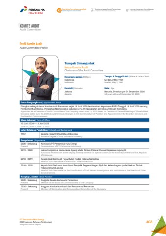 Komite auditAudit CommitteeTumpak SimanjuntakKetua Komite AuditChairman of the Audit CommitteeKewarganegaraan | CitizenUsia | AgeTempat & Tanggal Lahir | Place & Date of BirthDomisili | DomicileIndonesiaIndonesiaBerusia, 59 tahun per 31 Desember 202059 years old as of December 31, 2020Medan, 2 Mei 1961Medan, May 2, 1961JakartaJakartaDasar Pengangkatan | Appointment BasisDiangkat sebagai Ketua Komite Audit Perseroan sejak 13 Juni 2020 berdasarkan Keputusan RUPS Tanggal 13 Juni 2020 tentang Pemberhentian Direksi, Perubahan Nomenklatur Jabatan serta Pengangkatan Direksi dan Dewan Komisaris.Appointed as a Chairman of Audit Committee of the Company since June 13, 2020 based on Decision of General Meeting of Shareholders Circularly dated June 13, 2020 about Dismissal, Changes in the Nomenclature of Position and Appointment of the Board of Directors and the Board of Commissioners.Masa Jabatan | Term of Office13 Juni 2020 %u2013 12 Juni 2023 June 13, 2020 %u2013 June 12, 2023Latar Belakang Pendidikan | Educational Background1987 Sarjana Hukum Universitas Indonesia Bachelor Degree of Law, Indonesia UniversityPengalaman | Experience2020 - Sekarang PresentKomisaris PT Pertamina Hulu Energi Commissioner of PT Pertamina Hulu Energi2019 - 2020 Jaksa Fungsional pada Jaksa Agung Muda Tindak Pidana Khusus Kejaksaan Agung RIFunctional Prosecutors at the Deputy Attorney General for Special Crimes at the Attorney General's Office, Republic of Indonesia2018 - 2019 Kepala Sub Direktorat Penuntutan Tindak Pidana NarkotikaHead of Sub-Directorate of Narcotics Crime Prosecution2016 - 2018 Kepala Sub Direktorat Koordinasi Penyidik Pegawai Negeri Sipil dan Kelembagaan pada Direktur Tindak Pidana Umum LainnyaHead of Sub-Directorate for the Coordination of Civil Servant Investigators and Institutions at the Director of Other General CrimesRangkap Jabatan | Dual Position2020 - Sekarang PresentAnggota Dewan Komisaris PerseroanMember of the Board of Commissioners of the Company2020 - Sekarang PresentAnggota Komite Nominasi dan Remunerasi PerseroanMember of Nomination and Remuneration Committee of the CompanyProfil Komite AuditAudit Committee ProfileTata Kelola Perusahaan yang BaikGood Corporate GovernanceTanggung Jawab Sosial PerusahaanCorporate Social ResponsibilityLaporan Keuangan KonsolidasianConsolidated Financial ReportPT Pertamina Hulu Energi2020 Laporan Tahunan TerintegrasiIntegrated Annual Report 403