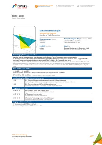 Komite auditAudit CommitteeMuhammad NoviansyahAnggota Komite AuditMember of Audit CommitteeKewarganegaraan | CitizenUsia | AgeTempat & Tanggal Lahir | Place & Date of BirthDomisili | DomicileIndonesiaIndonesiaBerusia, 56 tahun per 31 Desember 202056 years old as of December 31, 2020Jakarta, 27 November 1964Jakarta, November 27, 1964JakartaJakartaDasar Pengangkatan | Appointment BasisDiangkat sebagai Anggota Komite Audit berdasarkan SK Dekom Fax SVP Corporate Business Optimization, PT Pertamina (Persero) No.098/H40000/2019-S0 Tanggal 08 Mei 2019 perihal Penyampaian Usulan Calon Anggota Komite Audit dari Fungsi Internal Audit. SK Dekom No.Kpts-003/DK-PHE/2019-S8, Tanggal 21 Mei 2019.Appointed as a Member of Audit Committee of the Company based on the Board of Commissioners Decision Letter Fax SVP Corporate Business Optimization, PT Pertamina (Persero) No.098/H40000/2019-S0 dated May 08, 2019 regarding Submission of the Proposal for Candidates for the Audit Committee from the Internal Audit Function. Dekom Decree No.Kpts-003 / DK-PHE / 2019-S8, dated May 21, 2019.Masa Jabatan | Term of Office21 Mei 2019 %u2013 21 Mei 2021Pada Tanggal 01 Januari 2021 Mengundurkan diri sebagai Anggota Komite Audit PHE.May 21, 2019 %u2013 May 21, 2021On January 01, 2021 resigned as a member of the Audit Committee of PHE.Latar Belakang Pendidikan | Educational Background1996 S1 - Ekonomi Manajemen, Universitas Indonesia/Jakarta, IndonesiaBachelor Degree of Economics Management, University of Indonesia/ Jakarta, Indonesia1986 D-III Ekonomi Akuntansi, S.T.A.N Jakarta, IndonesiaDiploma III of Economics Accounting, S.T.A.N Jakarta, IndonesiaPengalaman | Experience2019 - 2020 VP Upstream, Gas & NRE Internal Audit Vice President Upstream, Gas & NRE Internal Audit 2015 - 2018 VP Corporate Internal AuditVice President Corporate Internal Audit2011 - 2015 Information Technology Internal Audit ManagerInformation Technology Internal Audit ManagerRangkap Jabatan | Dual PositionVP Upstream, Gas & NRE Internal Audit Vice President Upstream, Gas & NRE Internal Audit Tata Kelola Perusahaan yang BaikGood Corporate GovernanceTanggung Jawab Sosial PerusahaanCorporate Social ResponsibilityLaporan Keuangan KonsolidasianConsolidated Financial ReportPT Pertamina Hulu Energi2020 Laporan Tahunan TerintegrasiIntegrated Annual Report 407