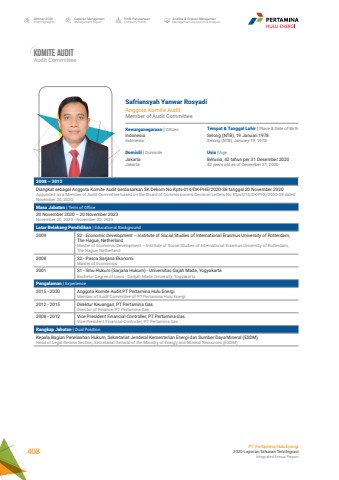Komite auditAudit CommitteeSafriansyah Yanwar RosyadiAnggota Komite AuditMember of Audit CommitteeKewarganegaraan | CitizenUsia | AgeTempat & Tanggal Lahir | Place & Date of BirthDomisili | DomicileIndonesiaIndonesiaBerusia, 42 tahun per 31 Desember 202042 years old as of December 31, 2020Selong (NTB), 19 Januari 1978Selong (NTB), January 19, 1978JakartaJakarta2008 %u2013 2012Diangkat sebagai Anggota Komite Audit berdasarkan SK Dekom No.Kpts-014/DK-PHE/2020-S8 tanggal 20 November 2020 Appointed as a Member of Audit Committee based on the Board of Commissioners Decision Letters No.Ktps-014/DK-PHE/2020-S8 dated November 20, 2020Masa Jabatan | Term of Office20 November 2020 %u2013 20 November 2023November 20, 2020 - November 20, 2023Latar Belakang Pendidikan | Educational Background2009 S2 - Economic Development %u2013 Institute of Social Studies of International Erasmus University of Rotterdam, The Hague, NetherlandMaster of Economic Development %u2013 Institute of Social Studies of International Erasmus University of Rotterdam, The Hague, Netherland2008 S2 - Pasca Sarjana EkonomiMaster of Economics2001 S1 - Ilmu Hukum (Sarjana Hukum) - Universitas Gajah Mada, YogyakartaBachelor Degree of Laws - Gadjah Mada University, YogyakartaPengalaman | Experience2015 - 2020 Anggota Komite Audit PT Pertamina Hulu EnergiMember of Audit Committee of PT Pertamina Hulu Energi2012 - 2015 Direktur Keuangan, PT Pertamina GasDirector of Finance, PT Pertamina Gas2008 - 2012 Vice President Financial Controller, PT Pertamina GasVice President Financial Controller, PT Pertamina GasRangkap Jabatan | Dual PositionKepala Bagian Penelaahan Hukum, Sekretariat Jenderal Kementerian Energi dan Sumber Daya Mineral (ESDM)Head of Legal Review Section, Secretariat General of the Ministry of Energy and Mineral Resources (ESDM)Laporan ManajemenManagement ReportProfil PerusahaanCompany ProfileAnalisa & Diskusi ManajemenManagement Discussion & AnalysisIkhtisar 20202020 HighlightsPT Pertamina Hulu Energi2020 Laporan Tahunan TerintegrasiIntegrated Annual Report 408