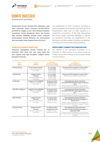 The establishment of PHE%u2019s Investment Committee is based on the Board of Commissioners Decree No.kpts-002/dk-phe/2020-s0 dated June 23, 2020 regarding to a Amandment nomenclature of the Risk Management and Human Capital Committee (MRSDM) to become the Investment Committee, the establishment of the Nomination and Remuneration Committee and Members of the Board of Commissioners%u2019 duties distribution.INVESTMENT COMMITTEE COMPOSITIONThe member of the Investment Committee as of December 31, 2020 consists of one chairman and one member who is also a member of the Company%u2019s Board of Commissioners.Pembentukan Komite Investasi PHE didasarkan pada Surat Keputusan Dewan Komisaris No.kpts-002/dkphe/2020-s0 tanggal 23 juni 2020 tentang Perubahan nomenklatur Komite Manajemen Risiko dan Sumber Daya Manusia (MRSDM) menjadi Komite Investasi, pembentukkan Komite Nominasi dan Remunerisasi serta pembagian tugas Anggota Dewan KomisarisKOMPOSISI KOMITE INVESTASI Komposisi keanggotaan Komite Investasi per 31 Desember 2020 terdiri dari satu orang ketua dan satu anggota yang juga merupakan Anggota Dewan Komisaris Perseroan.Nama NameJabatanPositionTanggal Berakhir JabatanEnd of Term of OfficeDasarPengangkatanBasis of AppointmentNanang Untung Ketua Komite InvestasiHead of Investment Committee23 Juni 2020 -22 Juni 2023June 23, 2020 -June 22, 2023Keputusan RUPS tanggal 28 Januari 2020GMS Decision dated January 28, 2020Fadli Rahman Anggota Komite InvestasiMember of Investment Committee23 Juni 2020 -22 Juni 2023June 23, 2020 -June 22, 2023Keputusan RUPS tanggal 28 Januari 2020GMS Decision dated January 28, 2020Ari Marsudi Anggota Komite MRSDMMember of MRSDM Committee28 Agustus 2018 - 28 Agustus 2021August 28, 2018 -August 28, 2021Surat Keputusan Dewan Komisaris No.045/DK-PHE/2018-S8 tanggal 28 Agustus 2018Decision Letter of the Board of CommissionersNo.045/DK-PHE/2018-S8 dated August 28, 2018Ninik Retno Wijayanti Anggota Komite MRSDMMember of MRSDM Committee24 Agustus 2017 -24 Agustus 2020August 24, 2017 -August 24, 2020Surat Keputusan Dewan Komisaris No.036/DK-PHE/2017-S8 tanggal 24 Agustus 2017Decision Letter of the Board of CommissionersNo.036/DK-PHE/2017-S8 dated August 24, 2017Sigit Rahardjo Anggota Komite InvestasiMember of Investment Committee10 Januari 2019 -10 Januari 2022January 10, 2019 -January 10, 2022Surat Keputusan Dewan Komisaris No.Kpts-002/DK-PHE/2019-S8 tanggal 12 Februari 2019Decision Letter of the Board of CommissionersNo.Kpts-002/DK-PHE/2019-S8 tanggal 1February 12, 2019Erwinsyah Putra Anggota Komite InvestasiMember of Investment Committee01 Oktober 2020 - 30 September 2023October 1, 2020 -September 30, 2023Surat Keputusan Dewan Komisaris No.Kpts-012/DK-PHE/2020-S8 tanggal 16 September 2020Decision Letter of the Board of CommissionersNo. Kpts-012/DK-PHE/2020-S8 tanggal September 16, 2020KOMITE INVESTASIInvestment CommitteeTata Kelola Perusahaan yang BaikGood Corporate GovernanceTanggung Jawab Sosial PerusahaanCorporate Social ResponsibilityLaporan Keuangan KonsolidasianConsolidated Financial ReportPT Pertamina Hulu Energi2020 Laporan Tahunan TerintegrasiIntegrated Annual Report 409
