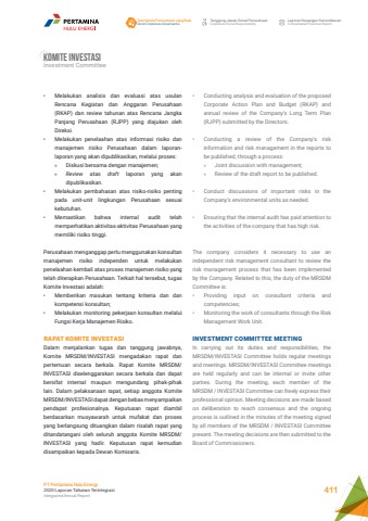 Komite InvestasiInvestment Committee%u2022 Melakukan analisis dan evaluasi atas usulan Rencana Kegiatan dan Anggaran Perusahaan (RKAP) dan review tahunan atas Rencana Jangka Panjang Perusahaan (RJPP) yang diajukan oleh Direksi. %u2022 Melakukan penelaahan atas informasi risiko dan manajemen risiko Perusahaan dalam laporanlaporan yang akan dipublikasikan, melalui proses: %u00bb Diskusi bersama dengan manajemen; %u00bb Review atas draft laporan yang akan dipublikasikan.%u2022 Melakukan pembahasan atas risiko-risiko penting pada unit-unit lingkungan Perusahaan sesuai kebutuhan. %u2022 Memastikan bahwa internal audit telah memperhatikan aktivitas-aktivitas Perusahaan yang memiliki risiko tinggi. Perusahaan menganggap perlu menggunakan konsultan manajemen risiko independen untuk melakukan penelaahan kembali atas proses manajemen risiko yang telah diterapkan Perusahaan. Terkait hal tersebut, tugas Komite Investasi adalah: %u2022 Memberikan masukan tentang kriteria dan dan kompetensi konsultan; %u2022 Melakukan monitoring pekerjaan konsultan melalui Fungsi Kerja Manajemen Risiko. RAPAT KOMITE INVESTASIDalam menjalankan tugas dan tanggung jawabnya, Komite MRSDM/INVESTASI mengadakan rapat dan pertemuan secara berkala. Rapat Komite MRSDM/INVESTASI diselenggarakan secara berkala dan dapat bersifat internal maupun mengundang pihak-pihak lain. Dalam pelaksanaan rapat, setiap anggota Komite MRSDM/INVESTASI dapat dengan bebas menyampaikan pendapat profesionalnya. Keputusan rapat diambil berdasarkan musyawarah untuk mufakat dan proses yang berlangsung dituangkan dalam risalah rapat yang ditandatangani oleh seluruh anggota Komite MRSDM/INVESTASI yang hadir. Keputusan rapat kemudian disampaikan kepada Dewan Komisaris.%u2022 Conducting analysis and evaluation of the proposed Corporate Action Plan and Budget (RKAP) and annual review of the Company%u2019s Long Term Plan (RJPP) submitted by the Directors.%u2022 Conducting a review of the Company%u2019s risk information and risk management in the reports to be published, through a process:%u00bb Joint discussion with management;%u00bb Review of the draft report to be published.%u2022 Conduct discussions of important risks in the Company%u2019s environmental units as needed.%u2022 Ensuring that the internal audit has paid attention to the activities of the company that has high risk.The company considers it necessary to use an independent risk management consultant to review the risk management process that has been implemented by the Company. Related to this, the duty of the MRSDM Committee is:%u2022 Providing input on consultant criteria and competencies;%u2022 Monitoring the work of consultants through the Risk Management Work Unit.INVESTMENT COMMITTEE MEETINGIn carrying out its duties and responsibilities, the MRSDM/INVESTASI Committee holds regular meetings and meetings. MRSDM/INVESTASI Committee meetings are held regularly and can be internal or invite other parties. During the meeting, each member of the MRSDM / INVESTASI Committee can freely express their professional opinion. Meeting decisions are made based on deliberation to reach consensus and the ongoing process is outlined in the minutes of the meeting signed by all members of the MRSDM / INVESTASI Committee present. The meeting decisions are then submitted to the Board of Commissioners.Tata Kelola Perusahaan yang BaikGood Corporate GovernanceTanggung Jawab Sosial PerusahaanCorporate Social ResponsibilityLaporan Keuangan KonsolidasianConsolidated Financial ReportPT Pertamina Hulu Energi2020 Laporan Tahunan TerintegrasiIntegrated Annual Report 411