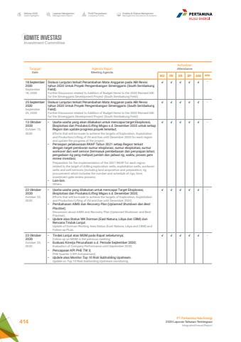 Komite InvestasiInvestment CommitteeLaporan ManajemenManagement ReportProfil PerusahaanCompany ProfileAnalisa & Diskusi ManajemenManagement Discussion & AnalysisIkhtisar 20202020 HighlightsPT Pertamina Hulu Energi2020 Laporan Tahunan TerintegrasiIntegrated Annual Report 414TanggalDateAgenda RapatMeeting Agenda KehadiranAttendanceNU FR SR EP AM NRW18 September 2020September 18, 2020Diskusi Lanjutan terkait Penambahan Mata Anggaran pada ABI Revisi tahun 2020 Untuk Proyek Pengembangan Simenggaris (South Sembakung Field).Further Discussion related to Addition of Budget Items to the 2020 Revised ABI for the Simenggaris Development Project (South Sembakung Field).%u221a %u221a %u221a %u221a %u221a -25 September 2020September 25, 2020Diskusi Lanjutan terkait Penambahan Mata Anggaran pada ABI Revisi tahun 2020 Untuk Proyek Pengembangan Simenggaris (South Sembakung Field).Further Discussion related to Addition of Budget Items to the 2020 Revised ABI for the Simenggaris Development Project (South Sembakung Field).%u221a %u221a %u221a %u221a %u221a -13 Oktober 2020October 13, 2020%u2022 Usaha-usaha yang akan dilakukan untuk mencapai target Eksplorasi, Eksploitasi dan Produksi/Lifting Migas s.d. Desember 2020 untuk setiap Region dan update progress proyek tersebut;Efforts that will be made to achieve the targets of Exploration, Exploitation and Production/Lifting of Oil and Gas until December 2020 for each region and update the progress of the project;%u2022 Persiapan pelaksanaan RKAP Tahun 2021 setiap Region terkait dengan target pemboran sumur eksplorasi, sumur eksploitasi, sumur workover dan well service (termasuk pembebasan dan penyiapan lahan; pengadaan rig yang meliputi jumlah dan jadwal rig, waktu; proses gate review investasi;Preparation for the implementation of the 2021 RKAP for each region related to the target of drilling exploration wells, exploitation wells, workover wells and well services (including land acquisition and preparation; rig procurement which includes the number and schedule of rigs, time; investment gate review process;%u2022 Lain-lain.Others.%u221a %u221a %u221a %u221a %u221a -22 Oktober 2020October 22, 2020%u2022 Usaha-usaha yang dilakukan untuk mencapai Target Eksplorasi, Eksploitasi dan Produksi/Lifting Migas s.d. Desember 2020;Efforts that will be made to achieve the targets of Exploration, Exploitation and Production/Lifting of Oil and Gas until December 2020;%u2022 Pembahasan AIMS dan Recovery Plan (Uplanned Shutdown dan Best Practise);Discussion about AIMS and Recovery Plan (Uplanned Shutdown and Best Practise);%u2022 Update atas Status WK Dorman (East Natuna, Libya dan CBM) dan Rencana Tindak Lanjut.Update of Dorman Working Area Status (East Natuna, Libya and CBM) and Follow-up PLan.%u221a %u221a %u221a %u221a %u221a -23 Oktober 2020October 23, 2020%u2022 Tindak Lanjut atas MOM pada Rapat sebelumnya;Follow up on MOM in the previous meeting;%u2022 Evaluasi Kinerja Perusahaan s.d. Periode September 2020;Evaluation of Company Performance until September 2020;%u2022 Pencapaian KPI PHE TW 3;PHE Quarter 3 KPI Achievement;%u2022 Update atas Monitor Top 10 Risk Subholding Upstream.Update on Top 10 Risk Subholding Upstream monitoring.%u221a %u221a %u221a %u221a %u221a -