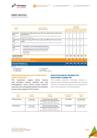 Komite InvestasiInvestment CommitteeEDUCATION AND/OR TRAINING FOR INVESTMENT COMMITTEEPHE includes Investment Committee members in education and/or training, both internally and externally. The aim is to improve the expertise and competence of each of the Investment Committee Members.PENDIDIKAN DAN/ATAU PELATIHAN UNTUK KOMITE INVESTASIPHE menyertakan anggota Komite Investasi pada pendidikan dan/atau pelatihan, baik yang diselenggarakan secara internal maupun eksternal. Tujuannya untuk meningkatkan keahlian dan kompetensi masing-masing anggota Komite Investasi.Nama NameJabatanPositionPelatihanTrainingPenyelenggaraOrganizerTanggalDateNanang Untung KomisarisCommissionerTraining Awareness System Management Anti Suap ISO 37001Training Awareness System Management Anti-bribery ISO 37001TUV NORD 4-5 Mei 2020May 4-5, 2020Fadli Rahman KomisarisCommissionerTraining Awareness System Management Anti Suap ISO 37001Training Awareness System Management Anti-bribery ISO 37001TUV NORD 4-5 Mei 2020May 4-5, 2020Tata Kelola Perusahaan yang BaikGood Corporate GovernanceTanggung Jawab Sosial PerusahaanCorporate Social ResponsibilityLaporan Keuangan KonsolidasianConsolidated Financial ReportPT Pertamina Hulu Energi2020 Laporan Tahunan TerintegrasiIntegrated Annual Report 415TanggalDateAgenda RapatMeeting Agenda KehadiranAttendanceNU FR SR EP AM NRW5 November 2020November 5, 2020Pembahasan AIMS dan Recovery Plan Serta Update Status WK Dorman (East Natuna).Discussion on AIMS and Recovery Plan also Dorman Working Area Status Update (East Natuna).%u221a %u221a %u221a %u221a %u221a -12 November 2020November 12, 2020Update atas Status WK Dorman (Libya dan CBM) dan Rencana Tindak Lanjut.Update on Dorman Working Area Status (Libya and CBM and Follow-up Plan.%u221a %u221a %u221a %u221a %u221a -12 November 2020November 12, 2020%u2022 Pengadaan Coach untuk kegiatan Eksplorasi;Procurement of coaches for exploration activities;%u2022 Strategi Eksplorasi untuk perolehan Big Fish;Exploration Strategy for Big Fish Achievement;%u2022 Fiscal Term.Fiscal Term.%u221a %u221a %u221a %u221a %u221a -Jumlah KehadiranTotal Attendance23 23 23 23 23 14Jumlah Rapat Komite InvestasiTotal Meeting of the Investment Committee23 23 23 23 23 14Persentase Kehadiran (%)Percentage of Attendance (%)100 100 100 100 100 100Note | Note%u2022%u0009 NU : Nanang Untung%u2022%u0009 FR : Fadli Rahman%u2022%u0009 SR : Sigit Rahardjo%u2022%u0009 EP : Erwinsyah Putra%u2022%u0009 AR : Ari Marsudi%u2022%u0009 NRW : Ninik Retno Wijayanti
