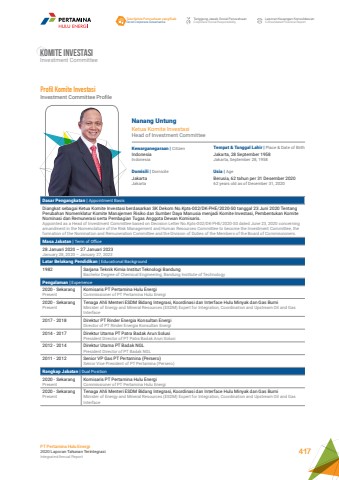 Komite InvestasiInvestment CommitteeNanang UntungKetua Komite InvestasiHead of Investment CommitteeKewarganegaraan | CitizenUsia | AgeTempat & Tanggal Lahir | Place & Date of BirthDomisili | DomicileIndonesiaIndonesiaBerusia, 62 tahun per 31 Desember 2020 62 years old as of December 31, 2020Jakarta, 28 September 1958Jakarta, September 28, 1958JakartaJakartaDasar Pengangkatan | Appointment BasisDiangkat sebagai Ketua Komite Investasi berdasarkan SK Dekom No.Kpts-002/DK-PHE/2020-S0 tanggal 23 Juni 2020 Tentang Perubahan Nomenklatur Komite Manajemen Risiko dan Sumber Daya Manusia menjadi Komite Investasi, Pembentukan Komite Nominasi dan Remunerasi serta Pembagian Tugas Anggota Dewan Komisaris.Appointed as a Head of Investment Committee based on Decision Letter No.Kpts-002/DK-PHE/2020-S0 dated June 23, 2020 concerning amandment in the Nomenclature of the Risk Management and Human Resources Committee to become the Investment Committee, the formation of the Nomination and Remuneration Committee and the Division of Duties of the Members of the Board of Commissioners.Masa Jabatan | Term of Office28 Januari 2020 %u2013 27 Januari 2023 January 28, 2020 %u2013 January 27, 2023Latar Belakang Pendidikan | Educational Background1982 Sarjana Teknik Kimia Institut Teknologi BandungBachelor Degree of Chemical Engineering, Bandung Institute of TechnologyPengalaman | Experience2020 - Sekarang PresentKomisaris PT Pertamina Hulu Energi Commissioner of PT Pertamina Hulu Energi2020 - Sekarang PresentTenaga Ahli Menteri ESDM Bidang Integrasi, Koordinasi dan Interface Hulu Minyak dan Gas BumiMinister of Energy and Mineral Resources (ESDM) Expert for Integration, Coordination and Upstream Oil and Gas Interface2017 - 2018 Direktur PT Rinder Energia Konsultan EnergiDirector of PT Rinder Energia Konsultan Energi2014 - 2017 Direktur Utama PT Patra Badak Arun SolusiPresident Director of PT Patra Badak Arun Solusi2012 - 2014 Direktur Utama PT Badak NGLPresident Director of PT Badak NGL2011 - 2012 Senior VP Gas PT Pertamina (Persero)Senior Vice President of PT Pertamina (Persero)Rangkap Jabatan | Dual Position2020 - Sekarang PresentKomisaris PT Pertamina Hulu EnergiCommissioner of PT Pertamina Hulu Energi2020 - Sekarang PresentTenaga Ahli Menteri ESDM Bidang Integrasi, Koordinasi dan Interface Hulu Minyak dan Gas BumiMinister of Energy and Mineral Resources (ESDM) Expert for Integration, Coordination and Upstream Oil and Gas InterfaceProfil Komite InvestasiInvestment Committee ProfileTata Kelola Perusahaan yang BaikGood Corporate GovernanceTanggung Jawab Sosial PerusahaanCorporate Social ResponsibilityLaporan Keuangan KonsolidasianConsolidated Financial ReportPT Pertamina Hulu Energi2020 Laporan Tahunan TerintegrasiIntegrated Annual Report 417
