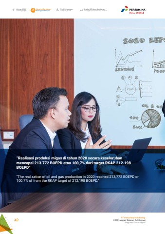 Laporan ManajemenManagement ReportProfil PerusahaanCompany ProfileAnalisa & Diskusi ManajemenManagement Discussion & AnalysisIkhtisar 20202020 HighlightsPT Pertamina Hulu Energi2020 Laporan Tahunan TerintegrasiIntegrated Annual Report 42%u201cRealisasi produksi migas di tahun 2020 secara keseluruhan mencapai 213.772 BOEPD atau 100,7% dari target RKAP 212.198 BOEPD%u201d%u201cThe realization of oil and gas production in 2020 reached 213,772 BOEPD or 100.7% of from the RKAP target of 212,198 BOEPD.%u201d