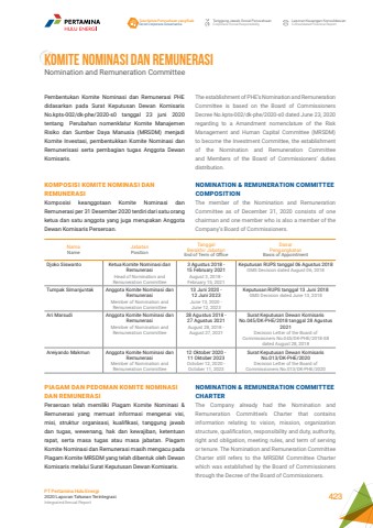 The establishment of PHE%u2019s Nomination and Remuneration Committee is based on the Board of Commissioners Decree No.kpts-002/dk-phe/2020-s0 dated June 23, 2020 regarding to a Amandment nomenclature of the Risk Management and Human Capital Committee (MRSDM) to become the Investment Committee, the establishment of the Nomination and Remuneration Committee and Members of the Board of Commissioners%u2019 duties distribution.NOMINATION & REMUNERATION COMMITTEE COMPOSITIONThe member of the Nomination and Remuneration Committee as of December 31, 2020 consists of one chairman and one member who is also a member of the Company%u2019s Board of Commissioners.NOMINATION & REMUNERATION COMMITTEE CHARTERThe Company already had the Nomination and Remuneration Committee%u2019s Charter that contains information relating to vision, mission, organization structure, qualification, responsibility and duty, authority, right and obligation, meeting rules, and term of serving or tenure. The Nomination and Remuneration Committee Charter still refers to the MRSDM Committee Charter which was established by the Board of Commissioners through the Decree of the Board of Commissioners.KOMITE NOMINASI DAN REMUNERASINomination and Remuneration CommitteePembentukan Komite Nominasi dan Remunerasi PHE didasarkan pada Surat Keputusan Dewan Komisaris No.kpts-002/dk-phe/2020-s0 tanggal 23 juni 2020 tentang Perubahan nomenklatur Komite Manajemen Risiko dan Sumber Daya Manusia (MRSDM) menjadi Komite Investasi, pembentukkan Komite Nominasi dan Remunerisasi serta pembagian tugas Anggota Dewan Komisaris.KOMPOSISI KOMITE NOMINASI DAN REMUNERASI Komposisi keanggotaan Komite Nominasi dan Remunerasi per 31 Desember 2020 terdiri dari satu orang ketua dan satu anggota yang juga merupakan Anggota Dewan Komisaris Perseroan.Nama NameJabatanPositionTanggal Berakhir JabatanEnd of Term of OfficeDasarPengangkatanBasis of AppointmentDjoko Siswanto Ketua Komite Nominasi dan RemunerasiHead of Nomination and Remuneration Committee3 Agustus 2018 -15 February 2021August 3, 2018 -February 15, 2021Keputusan RUPS tanggal 06 Agustus 2018GMS Decision dated August 06, 2018Tumpak Simanjuntak Anggota Komite Nominasi dan RemunerasiMember of Nomination and Remuneration Committee13 Juni 2020 -12 Juni 2023June 13, 2020 -June 12, 2023Keputusan RUPS tanggal 13 Juni 2018GMS Decision dated June 13, 2018Ari Marsudi Anggota Komite Nominasi dan RemunerasiMember of Nomination and Remuneration Committee28 Agustus 2018 - 27 Agustus 2021August 28, 2018 -August 27, 2021Surat Keputusan Dewan Komisaris No.045/DK-PHE/2018 tanggal 28 Agustus 2021Decision Letter of the Board of Commissioners No.045/DK-PHE/2018-S8 dated August 28, 2018Areiyando Makmun Anggota Komite Nominasi dan RemunerasiMember of Nomination and Remuneration Committee12 Oktober 2020 -11 Oktober 2023October 12, 2020 -October 11, 2023Surat Keputusan Dewan Komisaris No.013/DK-PHE/2020Decision Letter of the Board of Commissioners No.013/DK-PHE/2020PIAGAM DAN PEDOMAN KOMITE NOMINASI DAN REMUNERASIPerseroan telah memiliki Piagam Komite Nominasi & Remunerasi yang memuat informasi mengenai visi, misi, struktur organisasi, kualifikasi, tanggung jawab dan tugas, wewenang, hak dan kewajiban, ketentuan rapat, serta masa tugas atau masa jabatan. Piagam Komite Nominasi dan Remunerasi masih mengacu pada Piagam Komite MRSDM yang telah dibentuk oleh Dewan Komisaris melalui Surat Keputusan Dewan Komisaris.Tata Kelola Perusahaan yang BaikGood Corporate GovernanceTanggung Jawab Sosial PerusahaanCorporate Social ResponsibilityLaporan Keuangan KonsolidasianConsolidated Financial ReportPT Pertamina Hulu Energi2020 Laporan Tahunan TerintegrasiIntegrated Annual Report 423