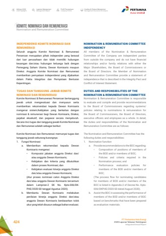 Komite nominasi dan remunerasiNomination and Remuneration CommitteeINDEPENDENSI KOMITE NOMINASI DAN REMUNERASI Seluruh anggota Komite Nominasi & Remunerasi Perseroan merupakan pihak independen yang berasal dari luar perusahaan dan tidak memiliki hubungan keuangan dan/atau hubungan keluarga baik dengan Pemegang Saham Utama, Dewan Komisaris maupun Direksi. Anggota Komite Nominasi dan Remunerasi memberikan pernyataan independensi yang dijabarkan dalam Pakta Integritas dan Pernyataan Benturan Kepentingan. TUGAS DAN TANGGUNG JAWAB KOMITE NOMINASI DAN REMUNERASIKomite Nominasi & Remunerasi Perseroan bertanggung jawab untuk mengevaluasi dan menyusun serta memberikan rekomendasi kepada Dewan Komisaris mengenai sistem/kebijakan yang berkaitan dengan nominasi & remunerasi bagi Dewan Komisaris, Direksi, pejabat eksekutif, dan pegawai secara menyeluruh. Secara rinci tugas dan tanggung jawab Komite Nominasi dan Remunerasi adalah sebagai berikut: Komite Nominasi dan Remunerasi memunyai tugas dan tanggung jawab sekurang-kurangnya: 1. Fungsi Nominasi: a. Memberikan rekomendasi kepada Dewan Komisaris mengenai: %u2022 Komposisi jabatan anggota Direksi dan/atau anggota Dewan Komisaris; %u2022 Kebijakan dan kriteria yang dibutuhkan dalam proses Nominasi; dan %u2022 Kebijakan evaluasi kinerja anggota Direksi dan/atau anggota Dewan Komisaris; (Alur proses nominasi calon Anggota Direksi dan/atau anggota Dewan Komisaris tercantum dalam Lampiran-2 SK No. Kpts-006/DKPHE/2020-S0 tanggal Agustus 2020). b. Membantu Dewan Komisaris melakukan penilaian kinerja anggota Direksi dan/atau anggota Dewan Komisaris berdasarkan tolok ukur yang telah disusun sebagai bahan evaluasi. NOMINATION & REMUNERATION COMMITTEE INDEPENDENCYAll members of the Nomination & Remuneration Committee of the Company are independent parties from outside the company and do not have financial relationships and/or family relations with either the Major Shareholders, the Board of Commissioners or the Board of Directors. the Member of Nomination and Remuneration Committee provide a statement of independence that is described in the Integrity Pact and Conflict of Interest Statement.DUTIES AND RESPONSIBILITIES OF THE NOMINATION & REMUNERATION COMMITTEENomination & Remuneration Committee is responsible to evaluate and compile and provide recommendations to the Board of Commissioners regarding systems/policies relating to nominations & remuneration for the Board of Commissioners, the Board of Directors, executive officers and employees as a whole. In detail, the duties and responsibilities of the Nomination and Remuneration Committee are as follows: The Nomination and Remuneration Committee has the following duties and responsibilities:1. Nomination functiona. Provide recommendations to the BOC regarding:%u2022 Composition of positions of members of the BOD and/or members of BOC;%u2022 Policies and criteria required in the Nomination process; and%u2022 Performance evaluation policies for members of the BOD and/or members of BOC; (The process flow for nominating candidates for members of BOD and/or members of the BOC is listed in Appendix-2 of Decree No. Kpts006/DKPHE/2020-S0 dated August 2020).b. Assist the BOC in assessing the performance of members of the BOD and/or members of BOC based on benchmarks that have been prepared as evaluation materials.Laporan ManajemenManagement ReportProfil PerusahaanCompany ProfileAnalisa & Diskusi ManajemenManagement Discussion & AnalysisIkhtisar 20202020 HighlightsPT Pertamina Hulu Energi2020 Laporan Tahunan TerintegrasiIntegrated Annual Report 424