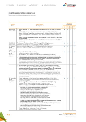 Komite nominasi dan remunerasiNomination and Remuneration CommitteeLaporan ManajemenManagement ReportProfil PerusahaanCompany ProfileAnalisa & Diskusi ManajemenManagement Discussion & AnalysisIkhtisar 20202020 HighlightsPT Pertamina Hulu Energi2020 Laporan Tahunan TerintegrasiIntegrated Annual Report 428TanggalDateAgenda RapatMeeting Agenda KehadiranAttendanceDS TS AM AM*9 Juni 2020June 9, 2020%u2022 Update Kesiapan ICT atas Pelaksanaan New Normal di PHE dan Anak Perusahaan PHE.Update ICT Readiness for Implementation of New Normal in PHE and Subsidiaries.%u2022 Update Efektifitas Pengelolaan atas Cyber Security Risk dan Mitigasi Top Risk CICT.Update on Management Effectiveness of Cyber Security Risk and Top Risk Mitigation of CICT.%u2022 Update Progress Penggunaan Aplikasi dan Digitalisasi Proses Bisnis PHE dan Anak Perusahaan PHE.Update the progress of application use and digitization of business processes for PHE and Subsidiaries.%u221a %u221a %u221a %u221a3 Juli 2020July 3, 2020Pembahasan Perubahan Status PT PHE sebagai Subholding Upstream.Discussion on Changes of PT PHE Status as Upstream Subholding.%u221a %u221a %u221a %u221a19 Agustus 2020August 19 2020Membahas Usulan Organisasi PT PHE Sebagai Subholding Upstream.Discussion on Proposal of PT PHE Organization as Upstream Subholding.%u221a %u221a %u221a %u221a24 September 2020September 24, 2020%u2022 Progres dan Isi Revisi Charter Hulu;Progress and Revision Chapter Upstream;%u2022 Progres dan isi revisi SOP Investasi dan Otorisasi Subholding Upstream;Progress and SOP Revision of Investment and Authorization of Upstream Subholding;%u2022 Progres pelaksanaan tugas Direktur, Fungsi Leher dan Managing Director Regional mengelola blok-blok sesuai Surat Keputusan Direksi PT Pertamina (Persero) No. Kpts-19/C00000/2020-S0 tanggal 16 Juni 2020.The progress of the implementation of the duties of the Director, Neck Function and the Regional Managing Director to manage the blocks according to the Decree of the Directors of PT Pertamina (Persero) No. Kpts-19/C00000/2020-S0 dated 16 June 2020.%u221a %u221a %u221a %u221a%u2022 Progres pelaksanaan Organisasi PT PHE Baru sesuai Risalah Rapat Direksi PT Pertamina Hulu Energi No. RRD-007/PHE000/2020-S0 tanggal 12 Agustus 2020 terkait dengan placement (pengisian jabatan), pengaturan pekerja non-established, revisi bisnis proses dan SOP, pengaturan kantor, dan kegiatan terkait.The progress of the implementation of the PT PHE Baru Organization is in accordance with the Minutes of the Meeting of the Directors of PT Pertamina Hulu Energi No. RRD007/PHE000/2020-S0 dated 12 August 2020 related to placements, arrangements for non-established workers, revision of business processes and SOPs, office arrangements, and related activities.27 September 2020September 27, 2020%u2022 Tindak Lanjut atas Arahan Komite Dekom pada rapat Selasa 15 Mei 2020;Follow-up of the Board of Commissioners' Committee instruction in the meeting on Tuesday May 15, 2020;%u2022 Tindak Lanjut Temuan Internal Audit & External 2019 dan 2020 (bila ada);Follow-up Internal Audit finding & External 2019 and 2020 (if any);%u2022 Realisasi Kinerja Fungsi HR TW2 Tahun 2020 Subholding Upstream:Realization of HR Function Performance Quarter 2 2020 Upstream Subholding:%u00bb Learning Hours Report and Competency Development;Learning Hours Report and Competency Development;%u00bb Employees Productivity Report (EBITDA/FTE);Employees Productivity Report (EBITDA/FTE);%u00bb Penilaian Kinerja (Performance Management System);Performance Assesment (Performance Management System);%u00bb Succession Planning, Talent Management and Promotion;Succession Planning, Talent Management and Promotion;%u00bb Pengisian Posisi Vacant untuk Level Manager, VP dan GM;Filling of Vacant Position for Manager, VP and GM Level;%u00bb Progres Persetujuan Organisasi satu level di bawah Managing Director Regional kepada HR Holding dan Dekom PT PHE; danProgress of Organization Aproval one level below the Regional Managing Director to HR Holding and PT PHE Board of Commissioners; and%u00bb Penyelesaian Permasalahan Hubungan Industrial (bila ada).Solving Industrial Relations Problems (if any).%u2022 Tindak Lanjut Survey Pelayanaan Fungsi HC (bila ada).Follow-up HC Function Services Survey (if any).%u221a %u221a %u221a %u221a