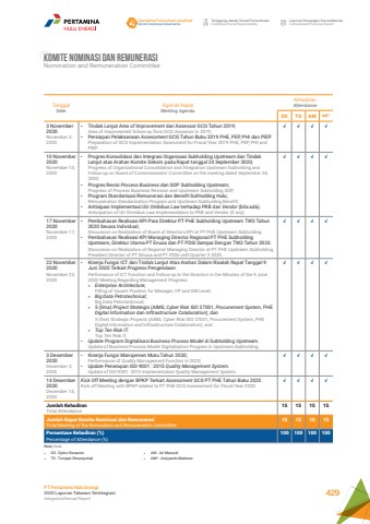 Komite nominasi dan remunerasiNomination and Remuneration CommitteeTata Kelola Perusahaan yang BaikGood Corporate GovernanceTanggung Jawab Sosial PerusahaanCorporate Social ResponsibilityLaporan Keuangan KonsolidasianConsolidated Financial ReportPT Pertamina Hulu Energi2020 Laporan Tahunan TerintegrasiIntegrated Annual Report 429TanggalDateAgenda RapatMeeting Agenda KehadiranAttendanceDS TS AM AM*3 November 2020November 3, 2020%u2022 Tindak Lanjut Area of Improvement dari Assessor GCG Tahun 2019;Area of Improvement follow-up from GCG Assessor in 2019;%u2022 Persiapan Pelaksanaan Assessment GCG Tahun Buku 2019 PHE, PEP, PHI dan PIEP.Preparation of GCG Implementation Assesment for Fiscal Year 2019 PHE, PEP, PHI and PIEP.%u221a %u221a %u221a %u221a10 November 2020November 10, 2020%u2022 Progres Konsolidasi dan Integrasi Organisasi Subholding Upstream dan Tindak Lanjut atas Arahan Komite Dekom pada Rapat tanggal 24 September 2020;Progress of Organizational Consolidation and Integration Upstream Subholding and Follow-up on Board of Commissioners' Committee on the meeting dated September 24, 2020;%u2022 Progres Revisi Process Business dan SOP Subholding Upstream;Progress of Process Business Revision and Upstream Subholding SOP;%u2022 Program Standarisasi Remunerasi dan Benefit Suhholding Hulu;Remuneration Standarization Program and Upstream Subholding Benefit;%u2022 Antisipasi Implementasi UU Ombibus Law terhadap PKB dan Vendor (bila ada).Anticipation of UU Omnibus Law Implementation to PKB and Vendor (if any).%u221a %u221a %u221a %u221a17 November 2020November 17, 2020%u2022 Pembahasan Realisasi KPI Para Direktur PT PHE Subholding Upstream TW3 Tahun 2020 Secara Individual;Discussion on Realization of Board of Directors KPI at PT PHE Upstream Subholding.%u2022 Pembahasan Realisasi KPI Managing Director Regional PT PHE Subholding Upstream, Direktur Utama PT Enusa dan PT PDSI Sampai Dengan TW3 Tahun 2020.Discussion on Realization of Regional Managing Director at PT PHE Upstream Subholding, President Director of PT Elnusa and PT PDSI until Quarter 3 2020.%u221a %u221a %u221a %u221a22 November 2020November 22, 2020%u2022 Kinerja Fungsi ICT dan Tindak Lanjut Atas Arahan Dalam Risalah Rapat Tanggal 9 Juni 2020 Terkait Progress Pengelolaan:Perfomance of ICT Function and Follow-up to the Direction in the Minutes of the 9 June 2020 Meeting Regarding Management Progress:%u00bb Enterprise Architecture;Filling of Vacant Position for Manager, VP and GM Level;%u00bb Big Data Petrotechnical;Big Data Petrotechnical;%u00bb 5 (lima) Project Strategis (AIMS, Cyber Risk ISO 27001, Procurement System, PHE Digital Information dan Inftrastructure Colaboration); dan5 (five) Strategic Projects (AIMS, Cyber Risk ISO 27001, Procurement System ,PHE Digital Information and Inftrastructure Colaboration); and%u00bb Top Ten Risk IT.Top Ten Risk IT.%u2022 Update Program Digitalisasi Business Process Model di Subholding Upstream.Update of Business Process Model Digitalization Program in Upstream Subholding.%u221a %u221a %u221a %u221a3 Desember 2020December 3, 2020%u2022 Kinerja Fungsi Manajemen Mutu Tahun 2020;Performance of Quality Management Function in 2020;%u2022 Update Penerapan ISO 9001 : 2015 Quality Management System.Update of ISO 9001: 2015 Implementation Quality Management System.%u221a %u221a %u221a %u221a14 Desember 2020December 14, 2020Kick Off Meeting dengan BPKP Terkait Assessment GCG PT PHE Tahun Buku 2020.Kick off Meeting with BPKP related to PT PHE GCG Assessment for FIscal Year 2020.%u221a %u221a %u221a %u221aJumlah KehadiranTotal Attendance15 15 15 15Jumlah Rapat Komite Nominasi dan RemunerasiTotal Meeting of the Nomination and Remuneration Committee15 15 15 15Persentase Kehadiran (%)Percentage of Attendance (%)100 100 100 100Note | Note%u2022%u0009 DS : Djoko Siswanto%u2022%u0009 TS : Tumpak Simanjuntak%u2022%u0009 AM : Ari Marsudi%u2022%u0009 AM* : Areiyando Makmun