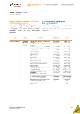PENDIDIKAN DAN/ATAU PELATIHAN UNTUK SEKRETARIS PERUSAHAANSelama tahun 2020, Sekretaris Perusahaan telah mengikuti berbagai pendidikan/pelatihan yang diselenggarakan secara internal dengan mengundang narasumber tenaga ahli guna meningkatkan kompetensi:EDUCATION AND/OR TRAINING FOR CORPORATE SECRETARYDuring 2020, the Corporate Secretary has participated in various education/training sessions that were held internally by inviting expert resource persons to improve competency:Nama NameJabatanPositionPelatihanTrainingPenyelenggaraOrganizerTanggalDateWhisnu Bahriansyah Sekretaris PerusahaanCorporate SecretarySeminar Legal Preventive Program \Signature\Legal Preventive Program \SeminarInternal PEPCPEPC Internal30 April 2020April 30, 2020Workshop Penyusunan Risalah CIP PEPCPEPC CIP Minutes Preparation WorkshopInternal PEPCPEPC Internal16 Juni 2020June 16 2020Sosialisasi GCGGCG SocializationInternal PEPCPEPC Internal25 Juli 2020July 25, 2020E-Learning COCE Learning COCInternal PEPCPEPC Internal25 Juli 2020July 25, 2020E-Learning COIE-Learning COIInternal PEPCPEPC Internal25 Juli 2020July 25, 2020E-Learning GratifikasiE-Learning GratificationInternal PEPCPEPC Internal25 Juli 2020July 25, 2020E-Learning Compliance Online SistemE-Learning Compliance Online SistemInternal PEPCPEPC Internal25 Juli 2020July 25, 2020E-Learning WBSE-Learning WBSInternal PEPCPEPC Internal25 Juli 2020July 25, 2020Workshop SDGs PHESDGs Workshop PHEInternal PEPCPEPC Internal10 Agustus 2020August 10, 2020Sosialisasi Visi & Misi, Tata Nilai PerusahaanCompany's Vision & Mission, Values SocializationInternal PEPCPEPC Internal14 Agustus 2020August 14, 2020In House Training (IHT) CID-CSRIn House Training (IHT) CID-CSRInternal PHEPHE Internal30 November 2020November 30,, 2020Pelatihan Penanggulangan Pencemaran (IMO) Tingkat 3 Batch III - 2020Pollution Prevention Training (IMO) Level 3 Batch III - 2020Internal PHEPHE Internal2-4 Desember 2020December 2- 4, 2020Sekretaris perusahaanCorporate SecretaryTata Kelola Perusahaan yang BaikGood Corporate GovernanceTanggung Jawab Sosial PerusahaanCorporate Social ResponsibilityLaporan Keuangan KonsolidasianConsolidated Financial ReportPT Pertamina Hulu Energi2020 Laporan Tahunan TerintegrasiIntegrated Annual Report 439