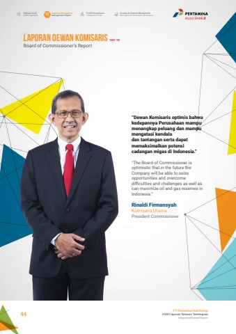 Rinaldi FirmansyahKomisaris UtamaPresident Commissioner%u201cDewan Komisaris optimis bahwa kedepannya Perusahaan mampumenangkap peluang dan mampu mengatasi kendaladan tantangan serta dapat memaksimalkan potensicadangan migas di Indonesia.%u201d%u201cThe Board of Commissioner is optimistic that in the future the Company will be able to seize opportunities and overcome difficulties and challenges as well as can maximize oil and gas reserves in Indonesia.%u201dLaporan ManajemenManagement ReportProfil PerusahaanCompany ProfileAnalisa & Diskusi ManajemenManagement Discussion & AnalysisIkhtisar 20202020 HighlightsPT Pertamina Hulu Energi2020 Laporan Tahunan TerintegrasiIntegrated Annual Report 44LAPORAN DEWAN KOMISARIS 102-14Board of Commissioner%u2019s Report