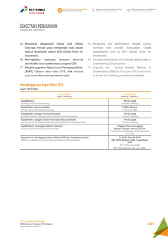Penyelenggaraan Rapat Tahun 20202020 MeetingsJenis RapatType of MeetingJumlah RapatMeeting FrequencyRapat DireksiBoarding of Directors Meeting49 kali rapat49 times meetingRapat Direksi Secara SirkulerCircular Board of Directors Meeting15 RRD Sirkuler15 Circular RRDRapat Direksi dengan Dewan KomisarisBoard of Directors Meeting with the Board of Commissioners19 kali rapat19 times meetingRapat Direksi dengan Dewan Komisaris Secara SirkulerCircular Board of Directors Meeting with the Board of Commissioners19 kali rapat19 times meetingRapat Umum Pemegang Saham Tahunan.Annual General Meeting of Shareholders1 Rapat Umum Pemegang Saham Tahunan secara Sirkuler1 Annual General Meeting of Shareholders CircularlyRapat Umum Pemegang Saham Sirkuler PHE dan Anak PerusahaanPHE and subsidiaries Circular General Meeting of Shareholders21 RUPS Sirkuler PHE201 RUPS Sirkuler Anak Perusahaan PHE21 PHE Circular GMS201 PHE Subsidiary Circular GMS15. Melakukan pengukuran kinerja CSR melalui beberapa metode yang memberikan hasil secara terukur (kuantitatif) seperti SROI (Social Return On Investment).16. Meningkatkan kemitraan bersama eksternal stakeholder dalam pelaksanaan program CSR.17. Menyelenggarakan Rapat Umum Pemegang Saham (RUPS) Tahunan tahun buku 2019, tidak terbatas pada acara dan materi presentasi rapat.15. Measuring CSR performance through several methods that provide measurable results (quantitative) such as SROI (Social Return On Investment).16. Increase partnerships with external stakeholders in implementing CSR programs.17. Organize the Annual General Meeting of Shareholders (GMS) for fiscal year 2019, not limited to events and meeting presentation materials.Sekretaris perusahaanCorporate SecretaryTata Kelola Perusahaan yang BaikGood Corporate GovernanceTanggung Jawab Sosial PerusahaanCorporate Social ResponsibilityLaporan Keuangan KonsolidasianConsolidated Financial ReportPT Pertamina Hulu Energi2020 Laporan Tahunan TerintegrasiIntegrated Annual Report 441