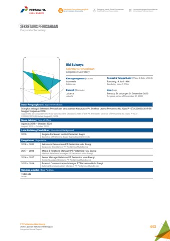 Sekretaris perusahaanCorporate SecretaryIfki SukaryaSekretaris PerusahaanCorporate SecretaryKewarganegaraan | CitizenUsia | AgeTempat & Tanggal Lahir | Place & Date of BirthDomisili | DomicileIndonesiaIndonesiaBerusia, 54 tahun per 31 Desember 202054 years old as of December 31, 2020Bandung, 9 Juni 1966Bandung, June 9 1966JakartaJakartaDasar Pengangkatan | Appointment BasisDiangkat sebagai Sekretaris Perusahaan berdasarkan Keputusan Plt. Direktur Utama Pertamina No. Kpts.P-127/C00000/2018-S8 tanggal 9 Agustus 2018.Appointed as Corporate Secretary based on the Decision Letter of the Plt. President Director of Pertamina No. Kpts. P-127/C00000/2018-S8 dated August 9, 2018.Masa Jabatan | Term of OfficeAgustus 2018 %u2013 Oktober 2020August 2019 %u2013 October 2020Latar Belakang Pendidikan | Educational Background2010 Sarjana Perikanan Institut Pertanian BogorBachelor of Fisheries, Bogor Agricultural UniversityPengalaman | Experience2018 %u2013 2020 Sekretaris Perusahaan PT Pertamina Hulu EnergiCorporate Secretary of PT Pertamina Hulu Energi2017 %u2013 2018 Media & Relations Manager PT Pertamina Hulu EnergiMedia & Relations Manager PT Pertamina Hulu Energi2016 %u2013 2017 Senior Manager Relations PT Pertamina Hulu EnergiSenior Manager Relations PT Pertamina Hulu Energi2015 %u2013 2016 External Communication Manager PT Pertamina Hulu EnergiExternal Communication Manager PT Pertamina Hulu EnergiRangkap Jabatan | Dual PositionTidak adaNoneTata Kelola Perusahaan yang BaikGood Corporate GovernanceTanggung Jawab Sosial PerusahaanCorporate Social ResponsibilityLaporan Keuangan KonsolidasianConsolidated Financial ReportPT Pertamina Hulu Energi2020 Laporan Tahunan TerintegrasiIntegrated Annual Report 443