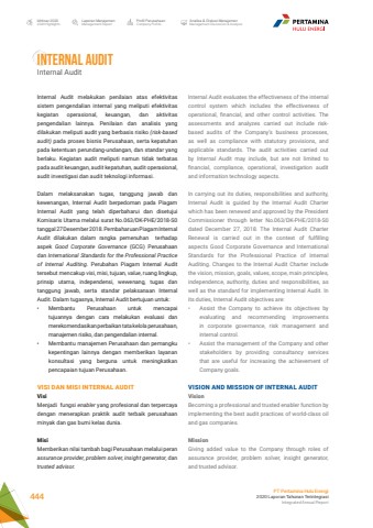 INTERNAL AUDITInternal AuditInternal Audit melakukan penilaian atas efektivitas sistem pengendalian internal yang meliputi efektivitas kegiatan operasional, keuangan, dan aktivitas pengendalian lainnya. Penilaian dan analisis yang dilakukan meliputi audit yang berbasis risiko (risk-based audit) pada proses bisnis Perusahaan, serta kepatuhan pada ketentuan perundang-undangan, dan standar yang berlaku. Kegiatan audit meliputi namun tidak terbatas pada audit keuangan, audit kepatuhan, audit operasional, audit investigasi dan audit teknologi informasi. Dalam melaksanakan tugas, tanggung jawab dan kewenangan, Internal Audit berpedoman pada Piagam Internal Audit yang telah diperbaharui dan disetujui Komisaris Utama melalui surat No.063/DK-PHE/2018-S0 tanggal 27 Desember 2018. Pembaharuan Piagam Internal Audit dilakukan dalam rangka pemenuhan terhadap aspek Good Corporate Governance (GCG) Perusahaan dan International Standards for the Professional Practice of Internal Auditing. Perubahan Piagam Internal Audit tersebut mencakup visi, misi, tujuan, value, ruang lingkup, prinsip utama, independensi, wewenang, tugas dan tanggung jawab, serta standar pelaksanaan Internal Audit. Dalam tugasnya, Internal Audit bertujuan untuk:%u2022 Membantu Perusahaan untuk mencapai tujuannya dengan cara melakukan evaluasi dan merekomendasikan perbaikan tata kelola perusahaan, manajemen risiko, dan pengendalian internal. %u2022 Membantu manajemen Perusahaan dan pemangku kepentingan lainnya dengan memberikan layanan konsultasi yang berguna untuk meningkatkan pencapaian tujuan Perusahaan.VISI DAN MISI INTERNAL AUDITVisiMenjadi fungsi enabler yang profesional dan terpercaya dengan menerapkan praktik audit terbaik perusahaan minyak dan gas bumi kelas dunia.MisiMemberikan nilai tambah bagi Perusahaan melalui peran assurance provider, problem solver, insight generator, dan trusted advisor.Internal Audit evaluates the effectiveness of the internal control system which includes the effectiveness of operational, financial, and other control activities. The assessments and analyzes carried out include riskbased audits of the Company%u2019s business processes, as well as compliance with statutory provisions, and applicable standards. The audit activities carried out by Internal Audit may include, but are not limited to financial, compliance, operational, investigation audit and information technology aspects. In carrying out its duties, responsibilities and authority, Internal Audit is guided by the Internal Audit Charter which has been renewed and approved by the President Commissioner through letter No.063/DK-PHE/2018-S0 dated December 27, 2018. The Internal Audit Charter Renewal is carried out in the context of fulfilling aspects Good Corporate Governance and International Standards for the Professional Practice of Internal Auditing. Changes to the Internal Audit Charter include the vision, mission, goals, values, scope, main principles, independence, authority, duties and responsibilities, as well as the standard for implementing Internal Audit. In its duties, Internal Audit objectives are:%u2022 Assist the Company to achieve its objectives by evaluating and recommending improvements in corporate governance, risk management and internal control.%u2022 Assist the management of the Company and other stakeholders by providing consultancy services that are useful for increasing the achievement of Company goals.VISION AND MISSION OF INTERNAL AUDITVisionBecoming a professional and trusted enabler function by implementing the best audit practices of world-class oil and gas companies.MissionGiving added value to the Company through roles of assurance provider, problem solver, insight generator, and trusted advisor.Laporan ManajemenManagement ReportProfil PerusahaanCompany ProfileAnalisa & Diskusi ManajemenManagement Discussion & AnalysisIkhtisar 20202020 HighlightsPT Pertamina Hulu Energi2020 Laporan Tahunan TerintegrasiIntegrated Annual Report 444