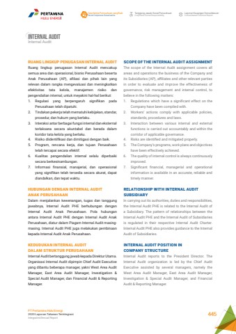 RUANG LINGKUP PENUGASAN INTERNAL AUDIT Ruang lingkup penugasan Internal Audit mencakup semua area dan operasional, bisnis Perusahaan beserta Anak Perusahaan (AP), afiliasi dan pihak lain yang relevan dalam rangka mengevaluasi dan meningkatkan efektivitas tata kelola, manajemen risiko dan pengendalian internal, untuk meyakini hal-hal berikut:1. Regulasi yang berpengaruh signifikan pada Perusahaan telah dipatuhi. 2. Tindakan pekerja telah mematuhi kebijakan, standar, prosedur, dan hukum yang berlaku. 3. Interaksi antar berbagai fungsi internal dan eksternal terlaksana secara akuntabel dan berada dalam koridor tata kelola yang berlaku. 4. Risiko diidentifikasi dan dimitigasi dengan baik. 5. Program, rencana kerja, dan tujuan Perusahaan telah tercapai secara efektif. 6. Kualitas pengendalian internal selalu diperbaiki secara berkesinambungan. 7. Informasi finansial, manajerial, dan operasional yang signifikan telah tersedia secara akurat, dapat diandalkan, dan tepat waktu.HUBUNGAN DENGAN INTERNAL AUDIT ANAK PERUSAHAANDalam menjalankan kewenangan, tugas dan tanggung jawabnya, Internal Audit PHE berhubungan dengan Internal Audit Anak Perusahaan. Pola hubungan antara Internal Audit PHE dengan Internal Audit Anak Perusahaan, diatur dalam Piagam Internal Audit masingmasing. Internal Audit PHE juga melakukan pembinaan kepada Internal Audit Anak Perusahaan.KEDUDUKAN INTERNAL AUDIT DALAM STRUKTUR PERUSAHAANInternal Audit bertanggung jawab kepada Direktur Utama. Organisasi Internal Audit dipimpin Chief Audit Executive yang dibantu beberapa manager, yakni West Area Audit Manager, East Area Audit Manager, Investigation & Special Audit Manager, dan Financial Audit & Reporting Manager. SCOPE OF THE INTERNAL AUDIT ASSIGNMENTThe scope of the Internal Audit assignment covers all areas and operations the business of the Company and its Subsidiaries (AP), affiliates and other relevant parties in order to evaluate and improve the effectiveness of governance, risk management and internal control, to believe in the following matters: 1. Regulations which have a significant effect on the Company have been complied with. 2. Workers%u2019 actions comply with applicable policies, standards, procedures and laws.3. Interaction between various internal and external functions is carried out accountably and within the corridor of applicable governance. 4. Risks are identified and mitigated properly. 5. The Company%u2019s programs, work plans and objectives have been effectively achieved. 6. The quality of internal control is always continuously improved.7. Significant financial, managerial and operational information is available in an accurate, reliable and timely manner.RELATIONSHIP WITH INTERNAL AUDIT SUBSIDIARYIn carrying out its authorities, duties and responsibilities, the Internal Audit PHE is related to the Internal Audit of a Subsidiary. The pattern of relationships between the Internal Audit PHE and the Internal Audit of Subsidiaries is regulated in their respective Internal Audit Charter. Internal Audit PHE also provides guidance to the Internal Audit of Subsidiaries.INTERNAL AUDIT POSITION IN COMPANY STRUCTUREInternal Audit reports to the President Director. The Internal Audit organization is led by the Chief Audit Executive assisted by several managers, namely the West Area Audit Manager, East Area Audit Manager, Investigation & Special Audit Manager, and Financial Audit & Reporting Manager.Internal AuditInternal AuditTata Kelola Perusahaan yang BaikGood Corporate GovernanceTanggung Jawab Sosial PerusahaanCorporate Social ResponsibilityLaporan Keuangan KonsolidasianConsolidated Financial ReportPT Pertamina Hulu Energi2020 Laporan Tahunan TerintegrasiIntegrated Annual Report 445