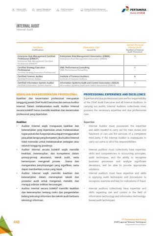 Sertifikasi CertificationDikeluarkan Oleh Issued ByJumlah Personel Internal AuditNumber of Internal Audit PersonnelEnterprise Risk Management Certified Profesional (ERMCP)Enterprise Risk Management Certified Profesional (ERMCP)Enterprises Risk Management Association (ERMA)Enterprises Risk Management Association (ERMA)1Certified Strategy Execution ProfessionalCertified Strategy Execution ProfessionalGML Performance ConsultingGML Performance Consulting1Certified Forensic AuditorCertified Forensic AuditorInstitute of Forensic AuditorsInstitute of Forensic Auditors6Certified Information System AuditorCertified Information System AuditorInformation Systems Audit and Control Association (ISACA)Information Systems Audit and Control Association (ISACA)1PROFESSIONAL EXPERIENCE AND EXCELLENCEExpertise and due professional care are the responsibility of the Chief Audit Executive and all Internal Auditors. In carrying out audits, Internal Auditors collectively must possess the necessary expertise and due professional care.Expertise%u2022 Internal Auditor must possesses the expertise and skills needed to carry out his main duties and functions or can use the services of a competent third party, if the Internal Auditor is inadequate to carry out some or all of his responsibilities.%u2022 Internal auditors must collectively have expertise, skills and competencies in accounting principles, audit techniques, and the ability to recognize business processes and analyze significant deviations, and be able to provide appropriate solutions.%u2022 Internal auditors must have expertise and skills in applying audit techniques and procedures to recognize, examine and test for indications of fraud.%u2022 Internal auditors collectively have expertise and skills regarding risk and control in the field of information technology and information technologybased audit techniques.KEAHLIAN DAN KECERMATAN PROFESIONALKeahlian dan kecermatan profesional merupakan tanggung jawab Chief Audit Executive dan semua Auditor Internal. Dalam melaksanakan audit, Auditor Internal secara kolektif harus memiliki keahlian dan kecermatan profesional yang diperlukan. Keahlian %u2022 Auditor Internal wajib menguasai keahlian dan keterampilan yang diperlukan untuk melaksanakan tugas pokok dan fungsinya atau dapat menggunakan jasa pihak ketiga yang kompeten, jika Auditor Internal tidak memadai untuk melaksanakan sebagian atau seluruh tanggung jawabnya. %u2022 Auditor Internal secara kolektif wajib memiliki keahlian, keterampilan, dan kompetensi dalam prinsip-prinsip akuntansi, teknik audit, serta kemampuan mengenali proses bisnis dan menganalisa penyimpangan yang signifikan, serta dapat memberikan solusi yang tepat.%u2022 Auditor Internal wajib memiliki keahlian dan keterampilan dalam menerapkan teknik dan prosedur audit untuk mengenali, meneliti, dan menguji adanya indikasi kecurangan. %u2022 Auditor Internal secara kolektif memiliki keahlian dan keterampilan tentang risiko dan pengendalian bidang teknologi informasi dan teknik audit berbasis teknologi informasi. Internal AuditInternal AuditLaporan ManajemenManagement ReportProfil PerusahaanCompany ProfileAnalisa & Diskusi ManajemenManagement Discussion & AnalysisIkhtisar 20202020 HighlightsPT Pertamina Hulu Energi2020 Laporan Tahunan TerintegrasiIntegrated Annual Report 448