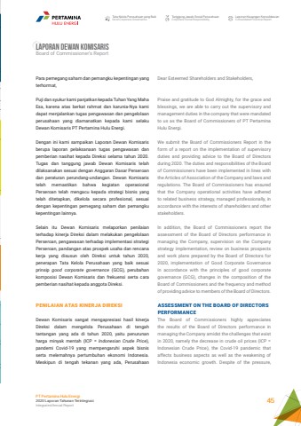 Tata Kelola Perusahaan yang BaikGood Corporate GovernanceTanggung Jawab Sosial PerusahaanCorporate Social ResponsibilityLaporan Keuangan KonsolidasianConsolidated Financial ReportPT Pertamina Hulu Energi2020 Laporan Tahunan TerintegrasiIntegrated Annual Report 45Laporan dewan komisarisBoard of Commissioner%u2019s Report Para pemegang saham dan pemangku kepentingan yang terhormat,Puji dan syukur kami panjatkan kepada Tuhan Yang Maha Esa, karena atas berkat rahmat dan karunia-Nya kami dapat menjalankan tugas pengawasan dan pengelolaan perusahaan yang diamanatkan kepada kami selaku Dewan Komisaris PT Pertamina Hulu Energi. Dengan ini kami sampaikan Laporan Dewan Komisaris berupa laporan pelaksanaan tugas pengawasan dan pemberian nasihat kepada Direksi selama tahun 2020. Tugas dan tanggung jawab Dewan Komisaris telah dilaksanakan sesuai dengan Anggaran Dasar Perseroan dan peraturan perundang-undangan. Dewan Komisaris telah memastikan bahwa kegiatan operasional Perseroan telah mengacu kepada strategi bisnis yang telah ditetapkan, dikelola secara profesional, sesuai dengan kepentingan pemegang saham dan pemangku kepentingan lainnya. Selain itu Dewan Komisaris melaporkan penilaian terhadap kinerja Direksi dalam melakukan pengelolaan Perseroan, pengawasan terhadap implementasi strategi Perseroan, pandangan atas prospek usaha dan rencana kerja yang disusun oleh Direksi untuk tahun 2020, penerapan Tata Kelola Perusahaan yang baik sesuai prinsip good corporate governance (GCG), perubahan komposisi Dewan Komisaris dan frekuensi serta cara pemberian nasihat kepada anggota Direksi. PENILAIAN ATAS KINERJA DIREKSIDewan Komisaris sangat mengapresiasi hasil kinerja Direksi dalam mengelola Perusahaan di tengah tantangan yang ada di tahun 2020, yaitu penurunan harga minyak mentah (ICP = Indonesian Crude Price), pandemi Covid-19 yang mempengaruhi aspek bisnis serta melemahnya pertumbuhan ekonomi Indonesia. Meskipun di tengah tekanan yang ada, Perusahaan Dear Esteemed Shareholders and Stakeholders,Praise and gratitude to God Almighty, for the grace and blessings, we are able to carry out the supervisory and management duties in the company that were mandated to us as the Board of Commissioners of PT Pertamina Hulu Energi.We submit the Board of Commissioners Report in the form of a report on the implementation of supervisory duties and providing advice to the Board of Directors during 2020. The duties and responsibilities of the Board of Commissioners have been implemented in lines with the Articles of Association of the Company and laws and regulations. The Board of Commissioners has ensured that the Company operational activities have adhered to related business strategy, managed professionally, in accordance with the interests of shareholders and other stakeholders.In addition, the Board of Commissioners report the assessment of the Board of Directors performance in managing the Company, supervision on the Company strategy implementation, review on business prospects and work plans prepared by the Board of Directors for 2020, implementation of Good Corporate Governance in accordance with the principles of good corporate governance (GCG), changes in the composition of the Board of Commissioners and the frequency and method of providing advice to members of the Board of Directors.ASSESSMENT ON THE BOARD OF DIRECTORS PERFORMANCEThe Board of Commissioners highly appreciates the results of the Board of Directors performance in managing the Company amidst the challenges that exist in 2020, namely the decrease in crude oil prices (ICP = Indonesian Crude Price), the Covid-19 pandemic that affects business aspects as well as the weakening of Indonesia economic growth. Despite of the pressure,