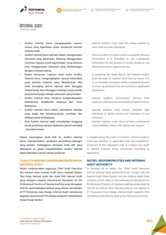 %u2022 Internal auditors must seek the means needed to meet Internal Audit Standards. %u2022 Internal auditors must be careful in using the required information. It is forbidden to use confidential information for the benefit of certain people or use information that is against the law.%u2022 In preparing the Audit Report, the Internal Auditor must disclose all material facts that he knows. If it is not revealed, all reports will be considered deviant or cover up practices that are contrary to applicable regulations. %u2022 Internal auditors continuously develop their expertise, effectiveness and quality of performance. %u2022 Internal auditors must always maintain high standards of ability, morale and dedication to the institution. %u2022 Internal Auditors must carry out their professional responsibilities wisely, with dignity and respect.In implementing this Code of Conduct, Internal Auditors must pay attention to applicable laws and regulations. Violations of this stipulated code of conduct can result in Internal Auditors being sanctioned according to regulations.DUTIES, RESPONSIBILITIES AND INTERNAL AUDIT AUTHORITYIn carrying out its duties, the Chief Audit Executive and all Internal Audit personnel must comply with the Internal Audit Work System and the Internal Audit Code of Ethics which refers to the International Standards for Professional Practice of Internal Auditing established by The IIA, as well as other relevant policies and applies to PT Pertamina Hulu Energi. Internal Audit supports PHE operational activities by playing the following functions: %u2022 Auditor Internal harus mengupayakan saranasarana yang diperlukan untuk memenuhi Standar Internal Audit. %u2022 Auditor Internal harus hati-hati dalam menggunakan informasi yang diperlukan. Dilarang menggunakan informasi rahasia untuk kepentingan orang tertentu atau menggunakan informasi yang bertentangan dengan undang-undang. %u2022 Dalam menyusun Laporan Hasil Audit, Auditor Internal harus mengungkapkan semua fakta-fakta yang bersifat material yang diketahuinya. Bila tidak terungkap semua laporan akan dianggap menyimpang atau dianggap menutup-nutupi praktik yang bertentangan dengan peraturan yang berlaku. %u2022 Auditor Internal terus menerus mengembangkan keahliannya, keefektifan kerjanya dan mutu kinerjanya. %u2022 Auditor Internal harus selalu memelihara standar yang tinggi dari kemampuannya, moralnya dan dedikasi pada lembaganya. %u2022 Para Auditor Internal wajib menjalankan tanggung jawab profesinya dengan bijaksana, penuh martabat , dan kehormatan. Dalam menerapkan Kode Etik ini, Auditor Internal harus memperhatikan peraturan perundang-undangan yang berlaku. Pelanggaran terhadap kode etik yang ditetapkan ini dapat mengakibatkan Auditor Internal dapat dikenakan sanksi sesuai peraturan. TUGAS, TANGGUNG JAWAB DAN KEWENANGANINTERNAL AUDIT Dalam melaksanakan tugasnya, Chief Audit Executive dan seluruh insan Internal Audit harus menaati Sistem Tata Kerja Internal Audit dan Kode Etik Internal Audit yang mengacu kepada International Standards for the Professional Practice of Internal Auditing yang ditetapkan oleh IIA, serta kebijakan lainnya yang relevan dan berlaku di PT Pertamina Hulu Energi. Internal Audit mendukung kegiatan operasional PHE dengan berperan menjalankan fungsi-fungsi berikut:Internal AuditInternal AuditTata Kelola Perusahaan yang BaikGood Corporate GovernanceTanggung Jawab Sosial PerusahaanCorporate Social ResponsibilityLaporan Keuangan KonsolidasianConsolidated Financial ReportPT Pertamina Hulu Energi2020 Laporan Tahunan TerintegrasiIntegrated Annual Report 453