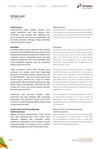 Audit/AssuranceAudit/assurance is an objective examination of evidence for the purpose of providing an independent assessment on governance, risk management and control processes so that it is able to give added value for the Company.Consultancy Consultancy is the activity of providing advice and other services needed by the client, the nature and scope of which has been agreed with the client aimed at adding value and improving the process of organizational governance, risk management, and control without any transfer of responsibility from management to the Internal Function. Audit. The Internal Audit consultancy function is designed to fulfill the mission as a catalyst for the functions in the Company and/or activities in JOB/PI/PPI/BOB and other joint ventures resulting from the acquisition or new establishment. This function includes assistance in the implementation of business processes for other functions as well as JOB/IP/PPI and BOB assistance as well as joint ventures resulting from acquisition or new establishment on request. The implementation of consultancy services is carried out within clear boundaries, so as not to reduce the independence and objectivity of Internal Audit in conducting assurance of the activities that are the object of consultancy.Internal Control over Financial Reporting (ICoFR) Assessment As a counterpart to ICoFR development, Internal Audit has encouraged the Control Owners to certify that the implementation of internal control is under their responsibility and as the third line of defense testing the results of the Testing Control Group.Audit/Assurance Audit/assurance adalah kegiatan pengujian yang objektif berdasarkan bukti, yang bertujuan untuk memberikan suatu penilaian yang independen atas proses pengelolaan risiko, aktivitas pengendalian, dan tata kelola perusahaan, sehingga mampu memberikan nilai tambah bagi Perusahaan. Konsultansi Konsultansi adalah kegiatan pemberian advis (nasihat) dan jasa lain yang dibutuhkan klien, yang sifat dan ruang lingkupnya telah disepakati dengan klien ditujukan untuk menambah nilai dan meningkatkan proses tata kelola organisasi, pengelolaan risiko, dan pengendalian tanpa adanya pengalihan tanggung jawab dari manajemen kepada Fungsi Internal Audit.Fungsi konsultansi Internal Audit dirancang untuk memenuhi misi sebagai katalis bagi fungsi-fungsi yang ada di Perusahaan dan/atau kegiatan yang ada di JOB/PI/PPI/BOB serta joint venture lainnya hasil akuisisi maupun pendirian baru. Fungsi ini meliputi pendampingan dalam pelaksanaan proses bisnis fungsi lainnya maupun pendampingan JOB/IP/PPI dan BOB maupun joint venture hasil akuisisi ataupun pendirian baru atas dasar permintaan. Pelaksanaan jasa konsultasi dilakukan dalam batas-batas yang jelas, sehingga tidak mengurangi independensi dan objektivitas Internal Audit dalam melakukan assurance terhadap kegiatan-kegiatan yang menjadi objek konsultansi. Internal Control over Financial Reporting (ICoFR) Assessment Sebagai counterpart pengembangan ICoFR, Internal Audit telah mendorong para Control Owner untuk melakukan sertifikasi yang menyatakan bahwa pelaksanaan pengendalian internal berada di bawah tanggung jawabnya dan sebagai third line of defense melakukan pengujian atas hasil Testing Control Group. Internal AuditInternal AuditLaporan ManajemenManagement ReportProfil PerusahaanCompany ProfileAnalisa & Diskusi ManajemenManagement Discussion & AnalysisIkhtisar 20202020 HighlightsPT Pertamina Hulu Energi2020 Laporan Tahunan TerintegrasiIntegrated Annual Report 454
