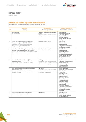 No PelatihanTrainingPenyelenggaraBasis of AppointmentPeserta Personel IA Personnel IA as Participant1 Sertifikasi QIAQIA CertificationYayasan Pendidikan Internal Audit (YPIA)Internal Audit Education Foundation (YPIA)%u2022 Beni Subena %u2022 Muhammad Satrio P. %u2022 Alfa Rega Montana %u2022 Yusuf Hadi Putra %u2022 Irra Nur Hegwisi %u2022 Indira Respati Sekarini %u2022 Nurhayati2 Awareness and Interpretation Anti Bribery Management System ISO 37001:2016Awareness and Interpretation Anti Bribery Management System ISO 37001:2016Patra Badak Arun Solusi %u2022 Deri Safari %u2022 Didit Kurniadi %u2022 Dana Maulana %u2022 Anggoro Endro Waskitho %u2022 M. Iqbal Suriaatmaja3 Internal Audit Anti Bribery Management System ISO 37001:2016 Based on ISO 19011:2018Internal Audit Anti Bribery Management System ISO 37001:2016 Based on ISO 19011:2018Patra Badak Arun Solusi %u2022 Yopi Taofik %u2022 Dana Maulana %u2022 Firman Nurzaman %u2022 Widosari Sudewi %u2022 Anggoro Endro Waskitho %u2022 Indira Respati Sekarini %u2022 M. Iqbal Suriaatmaja%u2022 Nurhayati4 Forum Auditor Migas Indonesia (FAMI) Discussion GroupIndonesia Oil and Gas Auditor Forum (FAMI) Discussion GroupSKK MigasSpecial Task Force for Upstream Oil and Gas Bussiness Activities Republic of Indonesia (SKK Migas)%u2022 Budhi Dermawan %u2022 Sambodo Handojo Hardjo%u2022 Wahyu Pramono %u2022 Gunawan Adiyoso %u2022 Widosari Sudewi %u2022 Daruno Prakoso5 2020 International Convention on Indonesian Upstream Oil & Gas2020 International Convention on Indonesian Upstream Oil & GasSKK MigasSpecial Task Force for Upstream Oil and Gas Bussiness Activities Republic of Indonesia (SKK Migas)%u2022 Budhi Dermawan %u2022 Sambodo Handojo Hardjo %u2022 Didit Kurniadi %u2022 Yopi Taofik %u2022 Dana Maulana %u2022 Wahyu Pramono %u2022 Herman Antono %u2022 Gunawan Adiyoso %u2022 Firman Nurzaman %u2022 Widosari Sudewi %u2022 Daruno Prakoso %u2022 Irra Nur Hegwisi %u2022 Randhi Aphar %u2022 Alfa Rega Montana %u2022 Anggoro Endro Waskitho%u2022 Indira Respati Sekarini %u2022 M. Iqbal Suriaatmaja %u2022 Nurhayati6 IIA Indonesia 2020 National ConferenceIIA Indonesia 2020 National ConferenceIIA Indonesia %u2022 Dana Maulana %u2022 Daruno Prakoso %u2022 Indira Respati Sekarini %u2022 M. Aulia NabighaPendidikan dan Pelatihan Bagi Auditor Internal Tahun 2020 Education and Training for Internal Auditor Members in 2020Internal AuditInternal AuditLaporan ManajemenManagement ReportProfil PerusahaanCompany ProfileAnalisa & Diskusi ManajemenManagement Discussion & AnalysisIkhtisar 20202020 HighlightsPT Pertamina Hulu Energi2020 Laporan Tahunan TerintegrasiIntegrated Annual Report 458