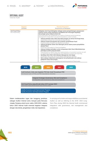 KegiatanActivitiesPeserta Personel IA Personnel IA as ParticipantAnti Fraud PolicyAnti Fraud PolicyKebijakan Anti Fraud ditetapkan sebagai sarana pengembangan pengawasaninternal control untuk membantu mendeteksi dan mencegah terjadinya kecurangan yang meliputi antara lain: Anti Fraud policy was established as a means of internal control monitoring development to help detect and prevent fraudulence, which includes: %u2022 Adanya penilaian atas risiko fraud (kecurangan) di semua lini/fungsi kerja. Assessment of fraud risk in all lines/working function.%u2022 Adanya inisiatif pencegahan dan prosedur pendeteksian fraud. Fraud prevention initiative and detection procedure. %u2022 Adanya pemberian akses dan dukungan penuh dalam proses penyelidikan adanya fraud. Full access and support in fraud investigation.%u2022 Adanya tindakan perbaikan untuk mengurangi risiko fraud, diberlakukannya penerapan sanksi yang konsisten. Improvements to reduce fraud risk, implementation of consistent sanction as well as mechanism for the management and settlement of fraud case reporting.%u2022 Sertifikasi ISO 37001:2016 (Sistem Manajemen Anti Suap). Certification ISO 37001:2016 (Anti-Bribery Management System). %u2022 Serta adanya mekanisme penanganan dan penyelesaian atas adanya pelaporan kasus kecurangan. There is a mechanism for handling and resolving reports of fraud cases.2018 2019 2020 2021 2022Audit berbasis risiko atas kegiatan PHE dan Anak Perusahaan PHERisk Based Audit of PHE and PHE Subsidiaries ActivitiesIntegrasi IA dengan Governance, Risk and ComplianceIA Integration with Governance, Risk and ComplianceAnti Fraud Policy yang dimulai tahun 2019 sampai 2022Anti Fraud Policy which starts from 2019 to 2022Quality Assurance and Improvement ProgramQuality Assurance and Improvement ProgramIn carrying out its duties and responsibilities as an Internal Auditor as well as referring to the 2018- 2022 LongTerm Plan, during 2020 the Internal Audit commenced integration with governance, risk management and compliance. Dalam melaksanakan tugas dan tanggung jawabnya sebagai Auditor Internal serta merujuk pada Rencana Jangka Panjang untuk kurun waktu 2020-2022, selama tahun 2020 Internal Audit memulai kegiatan integrasi dengan tata kelola, pengelolaan risiko dan kepatuhan. Internal AuditInternal AuditLaporan ManajemenManagement ReportProfil PerusahaanCompany ProfileAnalisa & Diskusi ManajemenManagement Discussion & AnalysisIkhtisar 20202020 HighlightsPT Pertamina Hulu Energi2020 Laporan Tahunan TerintegrasiIntegrated Annual Report 460