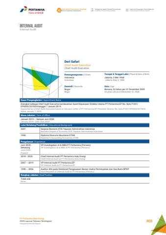 Deri SafariChief Audit ExecutiveChief Audit ExecutiveKewarganegaraan | CitizenUsia | AgeTempat & Tanggal Lahir | Place & Date of BirthDomisili | DomicileIndonesiaIndonesiaBerusia, 52 tahun per 31 Desember 202052 years old as of December 31, 2020Jakarta, 3 Mei 1968 Jakarta, May 3, 1968BogorBogorDasar Pengangkatan | Appointment BasisDiangkat sebagai Chief Audit Executive berdasarkan Surat Keputusan Direktur Utama PT Pertamina EP No. Kpts.P-001/EP0000/2019S-8 tanggal 7 Januari 2019.Appointed as a Chief Audit Executive based on Decision Letter of PT Pertamina EP President Director No. Kpts.P-001/EP0000/2019S-8 dated January 7, 2019.Masa Jabatan | Term of OfficeJanuari 2019 %u2013 Sampai Juni 2020January 2019 - Until June 2020Latar Belakang Pendidikan | Educational Background2001 Sarjana Ekonomi STIE Yayasan Administrasi IndonesiaBachelor Degree of Economy STIE Yayasan Administrasi Indonesia1990 Diploma Ekonomi Akuntansi STANDiploma in Accounting Economics STANPengalaman | ExperienceJuni 2020 - Sekarang June 2020 - PresentVP Investigation IA & WBS PT Pertamina (Persero)VP Investigation IA & WBS at PT Pertamina (Persero)2019 - 2020 Chief Internal Audit PT Pertamina Hulu Energi Chief Internal Audit at PT Pertamina Hulu Energi 2007 %u2013 2019 VP Internal Audit PT Pertamina EP VP Internal Audit at PT Pertamina EP 1990 %u2013 2006 Auditor Ahli pada Direktorat Pengawasan Badan Usaha Perminyakan dan Gas Bumi BPKPVice President of Internal Audit at PT Pertamina (Persero)Rangkap Jabatan | Dual PositionTidak adaNoneInternal AuditInternal AuditTata Kelola Perusahaan yang BaikGood Corporate GovernanceTanggung Jawab Sosial PerusahaanCorporate Social ResponsibilityLaporan Keuangan KonsolidasianConsolidated Financial ReportPT Pertamina Hulu Energi2020 Laporan Tahunan TerintegrasiIntegrated Annual Report 469