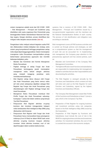 systems, that is revision of ISO 31000: 2009 - Risk Management - Principal and Guidelines issued by a non-governmental organization and the members are the National Standardization Bodies of each country. The process of risk identification and mitigation runs according to standards.Risk management covers all PHE business activities and is carried out through policies and strategies, as well as a comprehensive system so that the management of each risk can be accounted for. In implementing risk management, the Company pays attention to the precautionary approach and has several policies, such as:%u2022 Mandate and Commitment of the Company Risk Management Committee.%u2022 The highest officials in each function and subsidiaries are responsible for implementing risk management related to activities that are their responsibilities and documenting the activities.%u2022 The Risk Register is arranged annually by the Functions and Subsidiaries which contains all risks (all risks) and used as the Risk Register for each Function and Subsidiary, signed by the highest Functions and Subsidiary Officials.%u2022 The Company Risk Management create Risk Profile of the Functions and Subsidiaries at least 1 (once) a year, which is the Company%u2019s Top Risk.%u2022 Preparation of Risk Register for ongoing business and investment activities using risk categories based on the Risk Intelligence Map (RIM) issued by the Corporation.%u2022 Preparation of Risk Register by Functions and Subsidiaries must include the cost of risk in the RKAP, for ongoing business activities and investment activities. For investment activities, the cost of risk is counted into account in the economic analysis.sistem manajemen adalah revisi dari ISO 31000 : 2009 %u2013 Risk Management %u2013 Principal and Guidelines yang diterbitkan oleh suatu organisasi Non Pemerintah yang beranggotakan Badan Standardisasi Nasional dari tiaptiap negara. Dengan demikian, proses identifikasi dan mitigasi risiko berjalan sesuai standar. [102-12]Pengelolaan risiko meliputi seluruh kegiatan usaha PHE dan dilaksanakan melalui kebijakan dan strategi, serta sistem yang komprehensif sehingga pengelolaan setiap risiko dapat dipertanggungjawabkan. Dalam menerapkan manajemen risiko Perusahaan memperhatikan prinsip kehati-hatian (precautionary approach) dan memiliki beberapa kebijakan, yaitu:%u2022 Mandat dan Komitmen dari Komite Manajemen Risiko Perusahaan.%u2022 Pejabat tertinggi di setiap Fungsi dan Anak Perusahaan bertanggung jawab menerapkan manajemen risiko terkait dengan aktivitas yang menjadi tanggung jawabnya serta mendokumentasikannya.%u2022 Risk Register setiap tahun disusun oleh Fungsi dan Anak Perusahaan yang berisi semua risiko (all risk) untuk selanjutnya dijadikan sebagai Risk Register tiap Fungsi dan Anak Perusahaan yang ditandatangani oleh Pejabat tertinggi Fungsi dan Anak Perusahaan. %u2022 Manajemen Risiko Perusahaan membuat Risk Profile Fungsi dan Anak Perusahaan sekurangkurangnya 1 (satu) kali dalam setahun yang berupa Top Risk Perusahaan %u2022 Penyusunan Risk Register aktivitas on-going business dan investasi menggunakan kategori risiko berdasarkan Risk Intelligence Map (RIM) yang dikeluarkan oleh Korporat. %u2022 Penyusunan Risk Register oleh Fungsi dan Anak Perusahaan harus memasukkan biaya penanganan risikonya (Cost Of Risk) ke dalam RKAP, baik untuk aktivitas on-going business maupun aktivitas investasi. Untuk aktivitas investasi, cost of risk diperhitungkan dalam analisis keekonomian. Manajemen RisikoRisk ManagementLaporan ManajemenManagement ReportProfil PerusahaanCompany ProfileAnalisa & Diskusi ManajemenManagement Discussion & AnalysisIkhtisar 20202020 HighlightsPT Pertamina Hulu Energi2020 Laporan Tahunan TerintegrasiIntegrated Annual Report 472
