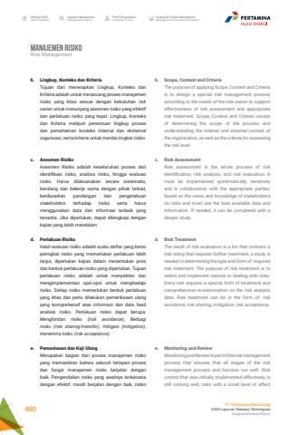 b. Scope, Context and Criteria The purpose of applying Scope, Context and Criteria is to design a special risk management process according to the needs of the risk owner to support effectiveness of risk assessment and appropriate risk treatment. Scope, Context and Criteria consist of determining the scope of the process and understanding the internal and external context of the organization, as well as the criteria for assessing the risk level.c. Risk Assessment Risk assessment is the whole process of risk identification, risk analysis, and risk evaluation. It must be implemented systematically, iteratively and in collaboration with the appropriate parties, based on the views and knowledge of stakeholders on risks and must use the best available data and information. If needed, it can be completed with a deeper study.d. Risk TreatmentThe result of risk evaluation is a list that contains a risk rating that requires further treatment, a study is needed in determining the type and form of required risk treatment. The purpose of risk treatment is to select and implement options to dealing with risks. Every risk requires a special form of treatment and comprehensive re-examination on the risk analysis data. Risk treatment can be in the form of: risk avoidance, risk sharing, mitigation, risk acceptance,e. Monitoring and Review Monitoring and Review is part of the risk management process that ensures that all stages of the risk management process and function run well. Risk control that was initially implemented effectively, is still running well, risks with a small level of effect b. Lingkup, Konteks dan KriteriaTujuan dari menerapkan Lingkup, Konteks dan Kriteria adalah untuk merancang proses manajemen risiko yang khas sesuai dengan kebutuhan risk owner untuk menunjang asesmen risiko yang efektif dan perlakuan risiko yang tepat. Lingkup, Konteks dan Kriteria meliputi penentuan lingkup proses dan pemahaman konteks internal dan eksternal organisasi, serta kriteria untuk menilai tingkat risiko.c. Asesmen RisikoAsesmen Risiko adalah keseluruhan proses dari identifikasi risiko, analisis risiko, hingga evaluasi risiko. Harus dilaksanakan secara sistematis, berulang dan bekerja sama dengan pihak terkait, berdasarkan pandangan dan pengetahuan stakeholders terhadap risiko serta harus menggunakan data dan informasi terbaik yang tersedia. Jika diperlukan, dapat dilengkapi dengan kajian yang lebih mendalam.d. Perlakuan RisikoHasil evaluasi risiko adalah suatu daftar yang berisi peringkat risiko yang memerlukan perlakuan lebih lanjut, diperlukan kajian dalam menentukan jenis dan bentuk perlakuan risiko yang diperlukan. Tujuan perlakuan risiko adalah untuk menyeleksi dan mengimplementasi opsi-opsi untuk menghadapi risiko. Setiap risiko memerlukan bentuk perlakuan yang khas dan perlu dilakukan pemeriksaan ulang yang komprehensif atas informasi dan data hasil analisis risiko. Perlakuan risiko dapat berupa: Menghindari risiko (risk avoidance), Berbagi risiko (risk sharing/transfer), mitigasi (mitigation), menerima risiko (risk acceptance).e. Pemantauan dan Kaji UlangMerupakan bagian dari proses manajemen risiko yang memastikan bahwa seluruh tahapan proses dan fungsi manajemen risiko berjalan dengan baik. Pengendalian risiko yang awalnya terlaksana dengan efektif, masih berjalan dengan baik, risiko Manajemen RisikoRisk ManagementLaporan ManajemenManagement ReportProfil PerusahaanCompany ProfileAnalisa & Diskusi ManajemenManagement Discussion & AnalysisIkhtisar 20202020 HighlightsPT Pertamina Hulu Energi2020 Laporan Tahunan TerintegrasiIntegrated Annual Report 480