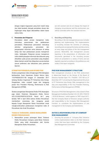 are still constant and do not change; the impact of changing circumstances and the environment can still be controlled within the standard risk limit.f. Recording and ReportingRecording in the risk management process includes planning and implementing. The implementation of recording includes the activities of collecting, recording and conveying information and documents at every stage and phase of the risk management process. Meanwhile, risk management process reporting is the presentation of information and documents generated in the recording process which are presented in a variety of forms and are regularly reported according to the preferences and needs of the report recipients.PHE RISK MANAGEMENT STRUCTURERisk management structure in the PHE environment is determined based on the Decree of the Board of Directors Number Kpts-119 / PHE000 / 2017-S8 on 27 December 2017 concerning the Organizational Structure of PT Pertamina Hulu Energi. Risk management is the duty and responsibility of the Vice President Planning, Performance & Risk Management (PPRM).Structure of PHE Risk Management is also stated in Risk Management Guidelines Number A (5.3.2) -005 / PHE010 / 2018-S9 Revision 1 which applies on TMT 6 April 2017, that the Company Board of Directors assigns authority and responsibility to the Company Risk Management Function. to coordinate the implementation of risk management in the Company and Subsidiaries.DUTIES & RESPONSIBILITIES OF COMPANY RISK MANAGEMENT1. Ensuring the process of Company Risk Tolerance Limits implementation refers to the Risk Tolerance Limits that have been submitted by the Company Risk Management Committee.dengan tingkat kegawatan yang kecil masih tetap dan tidak berubah; dampak perubahan situasi dan lingkungan tetap dapat dikendalikan dalam batas selera risiko.f. Pencatatan dan PelaporanPencatatan dalam proses manajemen risiko mencakup perencanaan dan pelaksanaan pencatatan. Pelaksanaan pencatatan mencakup aktivitas pengumpulan, pencatatan dan penyampaian informasi serta dokumen di setiap tahap dan fase pelaksanaan proses manajemen risiko. Sedangkan Pelaporan proses manajemen risiko adalah penyajian informasi dan dokumen yang dihasilkan pada proses pencatatan yang disajikan dalam bentuk variatif dan dilaporkan secara berkala sesuai preferensi dan kebutuhan para penerima laporan.STRUKTUR PENGELOLAAN RISIKO PHEStruktur pengelolaan risiko di lingkungan PHE ditetapkan berdasarkan Surat Keputusan Direksi Nomor Kpts119/PHE000/2017-S8 tanggal 27 Desember 2017 tentang Struktur Organisasi PT Pertamina Hulu Energi. Pengelolaan risiko menjadi tugas dan tanggung jawab Vice President Planning, Performance & Risk Management (PPRM).Struktur pengelolaan Manajemen Risiko PHE dituangkan juga dalam Pedoman Manajemen Risiko Nomor A(5.3.2)-005/PHE010/2018-S9 Revisi Ke-1 yang berlaku TMT 6 April 2020, bahwa Direksi Perusahaan memberikan wewenang dan tanggung jawab kepada Fungsi Manajemen Risiko Perusahaan untuk mengkoordinasikan pelaksanaan manajemen risiko di Perusahaan dan Anak Perusahaan.TUGAS & TANGGUNG JAWAB MANAJEMEN RISIKO PERUSAHAAN 1. Memastikan proses penerapan Batas Toleransi Risiko Perusahaan mengacu pada Batas Toleransi Risiko yang telah disampaikan oleh Komite Manajemen Risiko Perusahaan. Manajemen RisikoRisk ManagementTata Kelola Perusahaan yang BaikGood Corporate GovernanceTanggung Jawab Sosial PerusahaanCorporate Social ResponsibilityLaporan Keuangan KonsolidasianConsolidated Financial ReportPT Pertamina Hulu Energi2020 Laporan Tahunan TerintegrasiIntegrated Annual Report 481