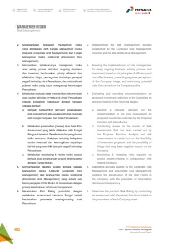2. Implementing the risk management policies established by the Corporate Risk Management Function and the Directorate Risk Management.3. Ensuring the implementation of risk management for every ongoing business activity process and investment, based on the principles of efficiency and cost effectiveness, preventing negative perceptions of the Company image, and minimizing potential risks that can reduce the Company profits.4. Evaluating and providing recommendations on proposed investment activities in the Subsidiary to decision makers in the following stages:a. Become a resource (advisor) for the implementation of the Risk Assessment on proposed investment activities by the Proposal Function and Subsidiaries.b. Conducting review on the results of Risk Assessment that has been carried out by the Proposer Function. Analysis and risk measurement is carried out on the feasibility of investment proposals and the possibility of things that may have negative impact on the Company.c. Monitoring & reviewing risks regularly on project implementation in collaboration with related functions.5. Submitting periodic reports to the Corporate Risk Management and Directorate Risk Management, contains the presentation of the Risk Profile in the Company with the principles of information disclosure/transparency.6. Determine the portfolio Risk Rating by conducting an assessment with the related functions based on the parameters of each Company asset.2. Melaksanakan kebijakan manajemen risiko yang ditetapkan oleh Fungsi Manajemen Risiko Korporat (Corporate Risk Management) dan Fungsi Manajemen Risiko Direktorat (Directorate Risk Management). 3. Memastikan terlaksananya manajemen risiko atas setiap proses aktivitas on-going business dan investasi, berdasarkan prinsip efisiensi dan efektivitas biaya, pencegahan timbulnya persepsi negatif terhadap citra Perusahaan, dan minimalisasi potensi risiko yang dapat mengurangi keuntungan Perusahaan. 4. Melakukan evaluasi serta memberikan rekomendasi atas usulan aktivitas investasi di Anak Perusahaan kepada pengambil keputusan dengan tahapan sebagai berikut: a. Menjadi narasumber (advisor) pelaksanaan Risk Assessment atas usulan aktivitas investasi oleh Fungsi Pengusul dan Anak Perusahaan.b. Melakukan penelaahan (review) atas hasil Risk Assessment yang telah dilakukan oleh Fungsi Pengusul tersebut. Penelaahan dan pengukuran risiko terutama dilakukan terhadap kelayakan usulan investasi dan kemungkinan terjadinya hal-hal yang memiliki dampak negatif terhadap Perusahaan. c. Melakukan monitoring & review risiko secara berkala atas pelaksanaan proyek bekerjasama dengan Fungsi terkait. 5. Menyampaikan laporan secara berkala kepada Manajemen Risiko Korporat (Corporate Risk Management) dan Manajemen Risiko Direktorat (Directorate Risk Management), yang antara lain berisi penyajian Profil Risiko di Perusahaan dengan prinsip keterbukaan informasi/transparansi. 6. Menentukan Risk Rating portofolio dengan melakukan assessment bersama Fungsi terkait berdasarkan parameter masing-masing aset Perusahaan. Manajemen RisikoRisk ManagementLaporan ManajemenManagement ReportProfil PerusahaanCompany ProfileAnalisa & Diskusi ManajemenManagement Discussion & AnalysisIkhtisar 20202020 HighlightsPT Pertamina Hulu Energi2020 Laporan Tahunan TerintegrasiIntegrated Annual Report 482