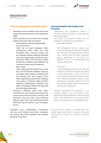 RISK MANAGEMENT IMPLEMENTATION STRATEGY%u2022 Implementing risk management system in accordance with the principles of Enterprise Risk Management (ERM).%u2022 PHE divides the Company activities into two categories to conducting risk management :%u00bb Ongoing Business RiskRisk Management Function assists each function and Subsidiaries formulate strategies that will be used by identifying risks that may occur. Starting from the RKAP preparation process, Subsidiaries as risk owners are required to carry out a risk assessment along with its mitigation plan.%u00bb Project RiskIn each Feasibility Study (FS) or new project, the Subsidiary is required to compile a risk register for early identification of risks that may arise in the project implementation. Several project risks, including exploration drilling, new field development, acquisitions, extension of oil and gas working areas and transfer of management of oil and gas working areas.%u2022 Company conducting risk assessment in its business portfolio to see the potential of each Subsidiary, including Subsidiaries contracts that will expire, a risk assessment is carried out to see the impact on the Company in a consolidated manner.Company also pay attention to possible risks from external parties (government, community and private sector) that will impact the Company operational activities.STRATEGI PENERAPAN MANAJEMEN RISIKO%u2022 Menerapkan sistem manajemen risiko yang sesuai dengan prinsip-prinsip Enterprise Risk Management (ERM). %u2022 Dalam melakukan risk assessment, PHE membagi kegiatan Perusahaan dalam dua kategori:%u00bb Risiko kegiatan usaha yang sedang berjalan (on-going business).Dalam hal ini Fungsi Manajemen Risiko mendampingi setiap fungsi dan Anak Perusahaan dalam menyusun strategi yang akan digunakan dengan melakukan identifikasi risiko yang mungkin terjadi. Dimulai dari proses penyusunan RKAP, Anak Perusahaan sebagai pemilik risiko diwajibkan untuk melakukan risk assessment beserta rencana mitigasinya.%u00bb Risiko ProyekDalam setiap Feasibility Study (FS) atau proyek baru, Anak Perusahaan diwajibkan menyusun risk register untuk melakukan identifikasi lebih dini terhadap risiko yang mungkin muncul dalam pelaksanaan proyek tersebut. Beberapa risiko proyek, di antaranya adalah pemboran eksplorasi, pengembangan lapangan baru, akuisisi, perpanjangan wilayah kerja migas dan alih kelola wilayah kerja migas. %u2022 Perusahaan melakukan kajian risiko dalam portofolio bisnis untuk melihat potensi-potensi dari masing-masing Anak Perusahaan, termasuk Anak Perusahaan yang akan habis masa kontraknya dilakukan kajian risiko untuk melihat dampak yang ditimbulkan bagi Perusahaan secara konsolidasi.[102-30]Perusahaan juga memperhatikan kemungkinan risiko dari pihak eksternal (pemerintah, masyarakat, dan swasta) yang akan berdampak pada kegiatan operasional Perusahaan.Manajemen RisikoRisk ManagementLaporan ManajemenManagement ReportProfil PerusahaanCompany ProfileAnalisa & Diskusi ManajemenManagement Discussion & AnalysisIkhtisar 20202020 HighlightsPT Pertamina Hulu Energi2020 Laporan Tahunan TerintegrasiIntegrated Annual Report 484