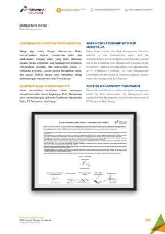 WORKING RELATIONSHIP WITH RISK MONITORINGEvery three months, the Risk Management Function submits a risk management report and the implementation of risk mitigation that has been carried out to the Enterprise Risk Management Function of the Investment Planning and Directorate Risk Management of PT Pertamina (Persero). The Risk Management Committee and the Board of Directors regularly monitor every risk management development.PHE RISK MANAGEMENT COMMITMENTTo ensure commitment in implementing risk management within the PHE environment, the Management has signed the Risk Management Commitment document of PT Pertamina Hulu Energi.HUBUNGAN KERJA DENGAN PEMANTAU RISIKOSetiap tiga bulan, Fungsi Manajemen Risiko menyampaikan laporan manajemen risiko dan pelaksanaan mitigasi risiko yang telah dilakukan kepada Fungsi Enterprise Risk Management Direktorat Perencanaan Investasi dan Manajemen Risiko PT Pertamina (Persero). Dewan Komite Manajemen Risiko dan jajaran Direksi secara rutin memantau setiap perkembangan manajemen risiko Perusahaan.KOMITMEN MANAJEMEN RISIKO PHEUntuk memastikan komitmen dalam penerapan manajemen risiko dalam lingkungan PHE, Manajemen telah menandatangani dokumen Komitmen Manajemen Risiko PT Pertamina Hulu Energi.Manajemen RisikoRisk ManagementTata Kelola Perusahaan yang BaikGood Corporate GovernanceTanggung Jawab Sosial PerusahaanCorporate Social ResponsibilityLaporan Keuangan KonsolidasianConsolidated Financial ReportPT Pertamina Hulu Energi2020 Laporan Tahunan TerintegrasiIntegrated Annual Report 485