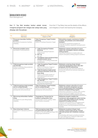 From the 11 Top Risks, here are the details of the effects and mitigation of each risk faced by the Company.Dari 11 Top Risk tersebut, berikut adalah rincian mengenai pengaruh dan mitigasi dari setiap risiko yang dihadapi oleh Perusahaan.Manajemen RisikoRisk ManagementNo Risk EventRisk EventPengaruh Pada PHEImpact on PHEMitigasiMitigation1 Penurunan keandalan fasilitas produksi.Decreased of production facilities reliability.Tidak Tercapainya Target Produksi Eksisting.Failure on Existing Production Target.Memastikan program maintenance fasilitas produksi, dan peralatan serta ketersediaan sparepart.Ensuring the maintenance program for production facilities, equipment and spare parts availability.2 Penurunan produksi sumur.Decreased in well production.1. Tidak Tercapainya Produksi Eksisting;Failure on Existing Production achievement;2. NPT rig;NPT rig;3. Peningkatan biaya pemboran/kerja ulang/perawatan sumur.Increase cost of drilling/rework/well maintenance.Melakukan evaluasi subsurface di sumur sekitar dan menyiapkan skenario antisipasi drilling program.Subsurface evaluation in nearby wells and prepare anticipatory drilling program scenarios.3 Tidak tercapainya target produksi dari WO/WS.Failure on Working Area production targets achievement.1. Tidak Tercapainya Target Produksi dari WO/WS;Failure on Production Target of Working Area achievement;2. Tidak tercapainya target jumlah pekerjaan perawatan sumur dan kerja ulang;Failure on the target number of well maintenance and rework achievement;3. Tidak Tercapainya Target Produksi dari WO/WS.Failure on Production Target of Working Area achievement.Melakukan screening design dengan subsurface berdasarkan lesson learn dari pengerjaan WO/WS sebelumnya.Screening design with subsurface based on the lessons learned from previous Operational Area's work.4 Tidak tercapainya target produksi dari bor pengembangan.Failure on production target of the development drill achievement.Tidak Tercapainya Target Produksi dari bor pengembangan.Failure on Production Target of the development drill achievement.Melakukan evaluasi subsurface di sumur sekitar, me-monitor pengadaan rig serta service pendukungnya serta menyiapkan skenario antisipasi drilling program.Subsurface evaluations in nearby wells, monitor rig procurement and support services and prepare anticipatory drilling program scenarios.5 Menurunnya kehandalan fasilitas lifting.Decreased of Lower lifting facility reliability.Terganggunya Transportasi ke Fasilitas Loading/Sales Point.Transportation to the Loading / Sales Point Facility is disrupted.Melakukan program inspeksi dan maintenance dan penggantian pada metering system, pipa SPM, floating house, mooring equipment & Fasilitas terminal.Inspection and maintenance and replacement programs for metering systems, SPM pipes, floating houses, mooring equipment & terminal facilities.6 Daya serap buyer menurun.Decreased of absorption power of buyers.Tidak tercapainya target liftingminyak/kondensat & gas PHE.Failure on The oil/condensate & gas PHE lifting target achievement.Melakukan koordinasi dengan buyer, memberi insentif harga jual gas, mencari alternatif pembeli dan melakukan realokasi gas.Coordinating with buyers, providing incentives for gas selling prices, looking for alternative buyers and reallocating gas.Laporan ManajemenManagement ReportProfil PerusahaanCompany ProfileAnalisa & Diskusi ManajemenManagement Discussion & AnalysisIkhtisar 20202020 HighlightsPT Pertamina Hulu Energi2020 Laporan Tahunan TerintegrasiIntegrated Annual Report 488