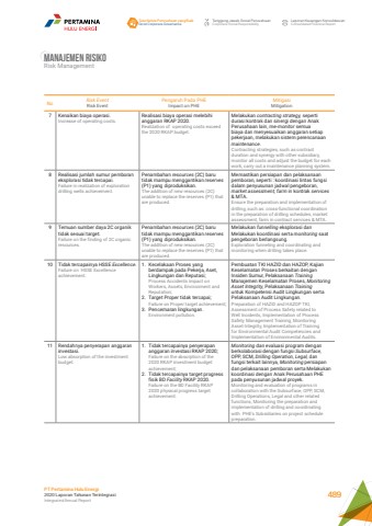 Manajemen RisikoRisk ManagementNo Risk EventRisk EventPengaruh Pada PHEImpact on PHEMitigasiMitigation7 Kenaikan biaya operasi.Increase of operating costs.Realisasi biaya operasi melebihi anggaran RKAP 2020.Realization of operating costs exceed the 2020 RKAP budget.Melakukan contracting strategy, seperti durasi kontrak dan sinergi dengan Anak Perusahaan lain, me-monitor semua biaya dan menyesuaikan anggaran setiap pekerjaan, melakukan sistem perencanaan maintenance.Contracting strategies, such as contract duration and synergy with other subsidiary, monitor all costs and adjust the budget for each work, carry out a maintenance planning system.8 Realisasi jumlah sumur pemboran eksplorasi tidak tercapai.Failure in realization of exploration drilling wells achievement.Penambahan resources (2C) baru tidak mampu menggantikan reserves(P1) yang diproduksikan.The addition of new resources (2C) unable to replace the reserves (P1) that are produced.Memastikan persiapan dan pelaksanaan pemboran, seperti : koordinasi lintas fungsi dalam penyusunan jadwal pengeboran, market assessment, farm in kontrak services & MTA. Ensure the preparation and implementation of drilling, such as: cross-functional coordination in the preparation of drilling schedules, market assessment, farm in contract services & MTA.9 Temuan sumber daya 2C organik tidak sesuai target.Failure on the finding of 2C organic resources.Penambahan resources (2C) baru tidak mampu menggantikan reserves(P1) yang diproduksikan.The addition of new resources (2C)unable to replace the reserves (P1) that are produced.Melakukan funnelling eksplorasi dan Melakukan koordinasi serta monitoring saat pengeboran berlangsung.Exploration funneling and coordinating and monitoring when drilling takes place.10 Tidak tercapainya HSSE Excellence.Failure on HSSE Excellence achievement.1. Kecelakaan Proses yang berdampak pada Pekerja, Aset, Lingkungan dan Reputasi;Process Accidents impact on Workers, Assets, Environment and Reputation;2. Target Proper tidak tercapai;Failure on Proper target achievement;3. Pencemaran lingkungan.Environment pollution.Pembuatan TKI HAZID dan HAZOP, Kajian Keselamatan Proses berkaitan dengan Insiden Sumur, Pelaksanaan Training Manajemen Keselamatan Proses, Monitoring Asset Integrity, Pelaksanaan Training untuk Kompetensi Audit Lingkungan serta Pelaksanaan Audit Lingkungan.Preparation of HAZID and HAZOP TKI, Assessment of Process Safety related to Well Incidents, Implementation of Process Safety Management Training, Monitoring Asset Integrity, Implementation of Training for Environmental Audit Competencies and Implementation of Environmental Audits.11 Rendahnya penyerapan anggaran investasi.Low absorption of the investment budget.1. Tidak tercapainya penyerapan anggaran investasi RKAP 2020;Failure on the absorption of the 2020 RKAP investment budget achievement;2. Tidak tercapainya target progress fisik BD Facility RKAP 2020.Failure on the BD Facility RKAP 2020 physical progress target achievement.Monitoring dan evaluasi program dengan berkolaborasi dengan fungsi Subsurface, OPP, SCM, Drilling Operation, Legal, dan fungsi terkait lainnya, Monitoring persiapan dan pelaksanaan pemboran serta Melakukan koordinasi dengan Anak Perusahaan PHE pada penyusunan jadwal proyek.Monitoring and evaluation of programs in collaboration with the Subsurface, OPP, SCM, Drilling Operations, Legal and other related functions, Monitoring the preparation and implementation of drilling and coordinating with PHE's Subsidiaries on project schedule preparation.Tata Kelola Perusahaan yang BaikGood Corporate GovernanceTanggung Jawab Sosial PerusahaanCorporate Social ResponsibilityLaporan Keuangan KonsolidasianConsolidated Financial ReportPT Pertamina Hulu Energi2020 Laporan Tahunan TerintegrasiIntegrated Annual Report 489