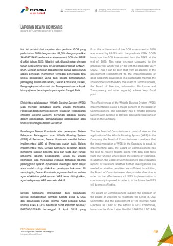 Tata Kelola Perusahaan yang BaikGood Corporate GovernanceTanggung Jawab Sosial PerusahaanCorporate Social ResponsibilityLaporan Keuangan KonsolidasianConsolidated Financial ReportPT Pertamina Hulu Energi2020 Laporan Tahunan TerintegrasiIntegrated Annual Report 49Laporan dewan komisarisBoard of Commissioner%u2019s Report Hal ini terbukti dari capaian atas penilaian GCG yang pada tahun 2020 dengan skor 88,08% dengan predikat SANGAT BAIK berdasarkan Assessment GCG dari BPKP di akhir tahun 2020. Nilai ini naik dibandingkan dengan tahun sebelumnya yaitu 87,50 dengan predikat SANGAT BAIK. Dengan demikian dapat terlihat bahwa dari seluruh aspek penilaian (Komitmen terhadap penerapan tata kelola perusahaan yang baik secara berkelanjutan, pemegang saham dan RUPS, Dewan Komisaris, Direksi, Pengungkapan Informasi dan Transparansi serta Aspek lainnya) terus berada pada pencapaian Sangat Baik.Efektivitas pelaksanaan Whistle Blowing System (WBS) juga menjadi perhatian utama Dewan Komisaris. Perseroan telah memiliki Sistem Pelaporan Pelanggaran (Whistle Blowing System) berfungsi sebagai sarana dalam pencegahan, pengungkapan pelanggaran atau tindak kecurangan dalam Perseroan.Pandangan Dewan Komisaris atas penerapan Sistem Pelaporan Pelanggaran atau Whistle Blowing System(WBS) di Perseroan, Dewan Komisaris menilai bahwa implementasi WBS di Perseroan sudah baik. Dalam implementasi WBS, Dewan Komisaris berperan dalam menerima laporan beserta data dan fakta dari fungsi penerima laporan pelanggaran. Selain itu Dewan Komisaris juga melakukan evaluasi terhadap laporan pelanggaran apakah diperlukan investigasi lebih lanjut atau sudah cukup dilakukan penetapan hukuman. Di samping itu, Dewan Komisaris juga memberikan arahan agar efektivitas pelaksanaan WBS terus ditingkatkan, agar kedepannya WBS semakin efektif. Dewan Komisaris menyambut baik keputusan Direksi mengaktifkan kembali Komite Etika & GCG dan penunjukan Fungsi Internal Audit sebagai Ketua Komite Etika & GCG, berdasar Surat Perintah No.024/ PHE000/2019-S0 tertanggal 8 April 2019 yang From the achievement of the GCG assessment in 2020 was scored by 88.08% with the predicate VERY GOOD based on the GCG Assessment from the BPKP at the end of 2020. This value increase compared to the previous year which was 87.50 with the predicate VERY GOOD. Thus it can be seen that from all aspects of the assessment (commitment to the implementation of good corporate governance in a sustainable manner, the shareholders and the GMS, the Board of Commissioners, the Board of Directors, Information Disclosure and Transparency and other aspects) achieve Very Good point.The effectiveness of the Whistle Blowing System (WBS) implementation is also a major concern of the Board of Commissioners. The Company has a Whistle Blowing System with purpose to prevent, disclosing violations or fraud in the Company.The the Board of Commissioners point of view on the application of the Whistle Blowing System (WBS) in the Company, the Board of Commissioners considers that the implementation of WBS in the Company is good. In implementing WBS, the Board of Commissioners has the role to receive reports along with data and facts from the function who receive the reports of violations. In addition, the Board of Commissioners also evaluates reports of violations whether further investigations are needed or whether penalties are sufficient. In addition, the Board of Commissioners also provides direction in order to the effectiveness of WBS implementation is continuously improved, in order to in the future the WBS will be more effective.The Board of Commissioners support the decision of the Board of Directors to reactivate the Ethics & GCG Committee and the appointment of the Internal Audit Function as Chair of the Ethics & GCG Committee, based on the Order Letter No.024 / PHE000 / 2019-S0