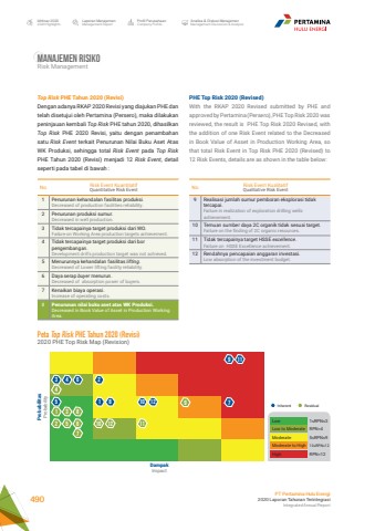 Manajemen RisikoRisk ManagementPHE Top Risk 2020 (Revised)With the RKAP 2020 Revised submitted by PHE and approved by Pertamina (Persero), PHE Top Risk 2020 was reviewed, the result is PHE Top Risk 2020 Revised, with the addition of one Risk Event related to the Decreased in Book Value of Asset in Production Working Area, so that total Risk Event in Top Risk PHE 2020 (Revised) to 12 Risk Events, details are as shown in the table beloTop Risk PHE Tahun 2020 (Revisi)Dengan adanya RKAP 2020 Revisi yang diajukan PHE dan telah disetujui oleh Pertamina (Persero), maka dilakukan peninjauan kembali Top Risk PHE tahun 2020, dihasilkan Top Risk PHE 2020 Revisi, yaitu dengan penambahan satu Risk Event terkait Penurunan Nilai Buku Aset Atas WK Produksi, sehingga total Risk Event pada Top RiskPHE Tahun 2020 (Revisi) menjadi 12 Risk Event, detail seperti pada tabel di bawah :No Risk Event KuantitatifQuantitative Risk Event1 Penurunan kehandalan fasilitas produksi.Decreased of production facilities reliability.2 Penurunan produksi sumur.Decreased in well production.3 Tidak tercapainya target produksi dari WO.Failure on Working Area production targets achievement.4 Tidak tercapainya target produksi dari bor pengembangan.Development drill's production target was not achieved.5 Menurunnya kehandalan fasilitas lifting.Decreased of Lower lifting facility reliability.6 Daya serap buyer menurun.Decreased of absorption power of buyers.7 Kenaikan biaya operasi.Increase of operating costs.8 Penurunan nilai buku aset atas WK Produksi.Decreased in Book Value of Asset in Production Working Area.No Risk Event KualitatifQualitative Risk Event9 Realisasi jumlah sumur pemboran eksplorasi tidak tercapai.Failure in realization of exploration drilling wells achievement.10 Temuan sumber daya 2C organik tidak sesuai target.Failure on the finding of 2C organic resources.11 Tidak tercapainya target HSSE excellence.Failure on HSSE Excellence achievement.12 Rendahnya pencapaian anggaran investasi.Low absorption of the investment budget.Peta Top Risk PHE Tahun 2020 (Revisi)2020 PHE Top Risk Map (Revision) Probabilitas ProbabilityDampakImpact410 11912935 1 101271148 12356 2867Low 1%u2264RPN%u22643RPN=4RPN=125%u2264RPN%u2264910%u2264RPN%u226412Inherent ResidualLow to ModerateModerate to HighHighModerateLaporan ManajemenManagement ReportProfil PerusahaanCompany ProfileAnalisa & Diskusi ManajemenManagement Discussion & AnalysisIkhtisar 20202020 HighlightsPT Pertamina Hulu Energi2020 Laporan Tahunan TerintegrasiIntegrated Annual Report 490