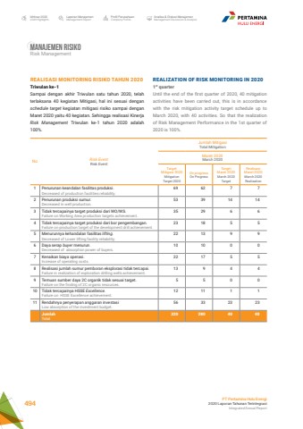 REALIZATION OF RISK MONITORING IN 20201st quarterUntil the end of the first quarter of 2020, 40 mitigation activities have been carried out, this is in accordance with the risk mitigation activity target schedule up to March 2020, with 40 activities. So that the realization of Risk Management Performance in the 1st quarter of 2020 is 100%.REALISASI MONITORING RISIKO TAHUN 2020Triwulan ke-1Sampai dengan akhir Triwulan satu tahun 2020, telah terlaksana 40 kegiatan Mitigasi, hal ini sesuai dengan schedule target kegiatan mitigasi risiko sampai dengan Maret 2020 yaitu 40 kegiatan. Sehingga realisasi Kinerja Risk Management Triwulan ke-1 tahun 2020 adalah 100%.No Risk EventRisk EventJumlah MitigasiTotal MitigationMaret 2020March 2020Target Mitigasi 2020Mitigation Target 2020On progressOn ProgressTarget Maret 2020March 2020 TargetRealisasiMaret 2020March 2020 Realization1 Penurunan keandalan fasilitas produksi.Decreased of production facilities reliability.69 62 7 72 Penurunan produksi sumur.Decreased in well production.53 39 14 143 Tidak tercapainya target produksi dari WO/WS.Failure on Working Area production targets achievement.35 29 6 64 Tidak tercapainya target produksi dari bor pengembangan.Failure on production target of the development drill achievement.23 18 5 55 Menurunnya kehandalan fasilitas lifting.Decreased of Lower lifting facility reliability.22 13 9 96 Daya serap buyer menurun.Decreased of absorption power of buyers.10 10 0 07 Kenaikan biaya operasi.Increase of operating costs.22 17 5 58 Realisasi jumlah sumur pemboran eksplorasi tidak tercapai.Failure in realization of exploration drilling wells achievement.13 9 4 49 Temuan sumber daya 2C organik tidak sesuai target.Failure on the finding of 2C organic resources.5 5 0 010 Tidak tercapainya HSSE Excellence.Failure on HSSE Excellence achievement.12 11 1 111 Rendahnya penyerapan anggaran investasiLow absorption of the investment budget.56 33 23 23JumlahTotal320 280 40 40Manajemen RisikoRisk ManagementLaporan ManajemenManagement ReportProfil PerusahaanCompany ProfileAnalisa & Diskusi ManajemenManagement Discussion & AnalysisIkhtisar 20202020 HighlightsPT Pertamina Hulu Energi2020 Laporan Tahunan TerintegrasiIntegrated Annual Report 494