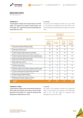 2nd quarterThe target of risk mitigation activities up to June 2020 is 161 activities and realization until June 2020 is 162. The KPI Enterprise Risk Management target is more than 100%.3rd quarterThe target of risk mitigation activities up to September 2020 is 226 activities and realization until September 2020 is 227. The KPI target for Enterprise Risk Management is more than 100%.Triwulan ke-2 Target kegiatan mitigasi risiko sampai dengan Juni 2020 adalah 161 kegiatan dan realisasi sampai dengan Juni 2020 adalah 162. Target KPI Enterprise Risk Management adalah lebih dari 100%.No Risk EventRisk EventJumlah MitigasiTotal MitigationJuni 2020June 2020Target Mitigasi 2020Mitigation Target 2020On progressOn ProgressTarget Juni 2020June 2020 TargetRealisasiJuni 2020June 2020 Realization1 Penurunan keandalan fasilitas produksi.Decreased of production facilities reliability.69 44 25 252 Penurunan produksi sumur.Decreased in well production.53 26 27 273 Tidak tercapainya target produksi dari WO/WS.Failure on Working Area production targets achievement.35 16 18 194 Tidak tercapainya target produksi dari bor pengembangan.Failure on production target of the development drill achievement.23 10 13 135 Menurunnya kehandalan fasilitas lifting.Decreased of Lower lifting facility reliability.22 9 13 136 Daya serap buyer menurun.Decreased of absorption power of buyers.10 5 5 57 Kenaikan biaya operasi.Increase of operating costs.22 10 12 128 Realisasi jumlah sumur pemboran eksplorasi tidak tercapai.Failure in realization of exploration drilling wells achievement.13 4 9 99 Temuan sumber daya 2C organik tidak sesuai target.Failure on the finding of 2C organic resources.5 3 2 210 Tidak tercapainya HSSE Excellence.Failure on HSSE Excellence achievement.12 9 3 311 Rendahnya penyerapan anggaran investasiLow absorption of the investment budget.56 22 34 34JumlahTotal320 158 161 162Triwulan ke-3 TahunTarget kegiatan mitigasi risiko sampai dengan September 2020 adalah 226 kegiatan dan realisasi sampai dengan September 2020 adalah 227. Target KPI Enterprise Risk Management adalah lebih dari 100%.Manajemen RisikoRisk ManagementTata Kelola Perusahaan yang BaikGood Corporate GovernanceTanggung Jawab Sosial PerusahaanCorporate Social ResponsibilityLaporan Keuangan KonsolidasianConsolidated Financial ReportPT Pertamina Hulu Energi2020 Laporan Tahunan TerintegrasiIntegrated Annual Report 495