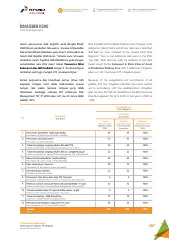 Risk Register with the RKAP 2020 revised, changes to the mitigation plan timeline and if new risks were identified that had not been included in the revised 2020 Risk Register. There is one additional risk event in the PHE Top Risk 2020 Revised, with the addition of one Risk Event related to the Decreased in Book Value of Asset in Production Working Area, with 5 additional mitigation plans so that it becomes 325 mitigation plans.Because of the cooperation and contribution of all parties, 325 risk mitigation activities have been carried out in accordance with the predetermined mitigation plan timeline. So that the realization of the KPI Enterprise Risk Management for Q IV 2020 or Full year in 2020 is 100%.dalam penyusunan Risk Register awal dengan RKAP 2020 Revisi, perubahan tata waktu rencana mitigasi dan bila teridentifikasi risiko baru yang belum dimasukkan ke dalam Risk Register 2020 revisi. Terdapat satu risk event tambahan dalam Top Risk PHE 2020 Revisi, yaitu dengan penambahan satu Risk Event terkait Penurunan Nilai Buku Aset Atas WK Produksi, dengan 5 rencana mitigasi tambahan sehingga menjadi 325 rencana mitigasi.Berkat kerjasama dan kontribusi semua pihak, 325 kegiatan mitigasi risiko telah dilaksanakan sesuai dengan tata waktu rencana mitigasi yang telah ditentukan. Sehingga realisasi KPI Enterprise Risk Management TW IV 2020 atau Full year di tahun 2020 adalah 100%.No Risk EventRisk EventJumlah MitigasiTotal MitigationDesemberDecemberTarget Mitigasi 2020Mitigation Target 2020RealisasiDesember 2020December 2020 RealizationRealisasi/Target 2020 (%)Realization/Target 20201 Penurunan keandalan fasilitas produksi.Decreased of production facilities reliability.69 69 100%2 Penurunan produksi sumur.Decreased in well production.53 53 100%3 Tidak tercapainya target produksi dari WO/WS.Failure on Working Area production targets achievement.35 35 100%4 Tidak tercapainya target produksi dari bor pengembangan.Failure on production target of the development drill achievement.23 23 100%5 Menurunnya kehandalan fasilitas lifting.Decreased of Lower lifting facility reliability.22 22 100%6 Daya serap buyer menurun.Decreased of absorption power of buyers.10 10 100%7 Kenaikan biaya operasi.Increase of operating costs.22 22 100%8 Penurunan Nilai Buku Aset atas WK Produksi.Decreased in Book Value of Asset in Production Working Area.5 5 100%9 Realisasi jumlah sumur pemboran eksplorasi tidak tercapai.Failure in realization of exploration drilling wells achievement.13 13 100%10 Temuan sumber daya 2C organik tidak sesuai target.Failure on the finding of 2C organic resources.5 5 100%11 Tidak tercapainya HSSE Excellence.Failure on HSSE Excellence achievement.12 12 100%12 Rendahnya penyerapan anggaran investasiLow absorption of the investment budget.56 56 100%JumlahTotal325 325 100%Manajemen RisikoRisk ManagementTata Kelola Perusahaan yang BaikGood Corporate GovernanceTanggung Jawab Sosial PerusahaanCorporate Social ResponsibilityLaporan Keuangan KonsolidasianConsolidated Financial ReportPT Pertamina Hulu Energi2020 Laporan Tahunan TerintegrasiIntegrated Annual Report 497