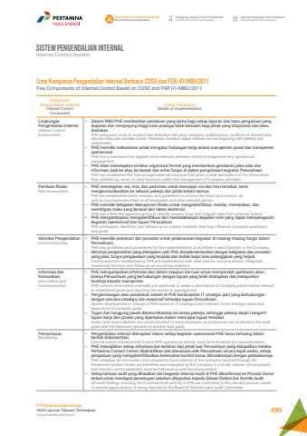 SISTEM PENGENDALIAN INTERNALInternal Control SystemLima Komponen Pengendalian Internal Berbasis COSO dan PER-01/MBU/2011Five Components of Internal Control Based on COSO and PER 01/MBU/2011Komponen Pengendalian InternalInternal Control ComponentUraian PenerapanDetails of ImplementationLingkungan Pengendalian InternalInternal Control Environment%u2022 Sistem WBS PHE memberikan perlakuan yang sama bagi setiap laporan dan/atau pengaduan yang diajukan dan menjunjung tinggi asas praduga tidak bersalah bagi pihak yang dilaporkan dan/atau diadukan.PHE menyusun code of conduct dan kebijakan lain yang mengatur praktik bisnis, conflicts of interest atau standar etika dan perilaku bisnis. Pedoman tersebut dapat diakses secara langsung oleh pekerja dan stakeholder. %u2022 PHE memiliki mekanisme untuk mengatur hubungan kerja antara manajemen pusat dan manajemen operasional. PHE has a mechanism to regulate work relations between central management and operational management. %u2022 PHE telah menetapkan struktur organisasi formal yang memberikan gambaran jelas atas alur informasi, baik ke atas, ke bawah dan antar fungsi di dalam pengelolaan kegiatan Perusahaan.PHE has established the formal organizational structure that gives a clear description of the information flow, whether up, down, or intra functions within the management of Company activities.Penilaian Risiko Risk Assessment%u2022 PHE menetapkan visi, misi, dan pedoman untuk mencapai visi dan misi tersebut, serta mengkomunikasikan ke seluruh pekerja dan pihak terkait lainnya. PHE has established vision, mission, and guidelines to achieve the vision and mission, aswell as communicates them to all employees and other relevant parties.%u2022 PHE memiliki kebijakan Manajemen Risiko untuk mengidentifikasi, menilai, memetakan, dan memitigasi risiko yang berasal dari faktor eksternal. PHE has a Risk Management policy to identify, assess, map, and mitigate risks from external factors.%u2022 PHE mengantisipasi, mengidentifikasi dan menindaklanjuti kejadian rutin yang dapat mempengaruhi kegiatan operasional dan tujuan Perusahaan.PHE anticipates, identifies, and follows-up on routine incidents that may influence Company operations and goals.Aktivitas PengendalianControl Activities%u2022 PHE memiliki pedoman dan prosedur untuk pelaksanaan kegiatan di masing-masing fungsi dalam Perusahaan.PHE has guidelines and procedures for the implementation of activities in each function in the Company.%u2022 Aktivitas pengendalian yang ditetapkan oleh PHE diimplementasikan dengan kebijakan dan prosedur yang jelas, fungsi pengawasan yang terpadu dan tindak lanjut atas pelanggaran yang terjadi.Control activities established by PHE are implemented with clear policies and procedures, integrated monitoring function, and follow-up on occurring violations.Informasi dan KomunikasiInformation and Communication%u2022 PHE mengumpulkan informasi dari dalam maupun dari luar untuk memperoleh gambaran akan kinerja Perusahaan yang berhubungan dengan tujuan yang telah ditetapkan dan melaporkan hasilnya kepada manajemen.PHE collects information internally and externally to obtain a description of Company performance relevant to established goals and reporting the results to management.%u2022 Pengembangan atau perubahan sistem di PHE berdasarkan IT strategic plan yang berhubungan dengan rencana strategis dan responsif terhadap tujuan Perusahaan.System development or change in PHE based on IT strategic plans relevant to the strategic plans and responsive to Company goals.%u2022 Tugas dan tanggung jawab dikomunikasikan ke setiap pekerja, sehingga pekerja dapat mengerti tujuan kerja dan proses yang diperlukan dalam mencapai tujuan tersebut.Duties and responsibilities are communicated to every employee, so employees can understand the work goals and the necessary process to achieve said goals.PemantauanMonitoring%u2022 Pengendalian internal diterapkan dalam setiap kegiatan operasional PHE harus tertuang dalam bentuk dokumentasi.Internal control implemented in each PHE operational activity must be formulated in a documentation.%u2022 PHE mewajibkan setiap informasi dan keluhan dari pihak luar Perusahaan yang didapatkan melalui Pertamina Contact Center, diidentifikasi dan dievaluasi oleh Perusahaan secara tepat waktu, setiap pengaduan yang mengidentifikasikan kelemahan kontrol harus ditindaklanjuti dengan perbaikannya.PHE obligates all information and complaints from external of the Company received through the Pertamina Contact Center are identified and evaluated by the Company in a timely manner, all complaints that identify control weakness must be followed-up with the improvement.%u2022 Setiap temuan audit yang dihasilkan dari kegiatan Internal Audit di PHE dikonfirmasi ke Process Ownerterkait untuk mendapat persetujuan sebelum dilaporkan kepada Dewan Direksi dan Komite Audit.All audit findings resulting from Internal Audit activity in PHE are confirmed to the relevant process owner to receive approval prior to being reported to the Board of Directors and Audit Committee.Tata Kelola Perusahaan yang BaikGood Corporate GovernanceTanggung Jawab Sosial PerusahaanCorporate Social ResponsibilityLaporan Keuangan KonsolidasianConsolidated Financial ReportPT Pertamina Hulu Energi2020 Laporan Tahunan TerintegrasiIntegrated Annual Report 499